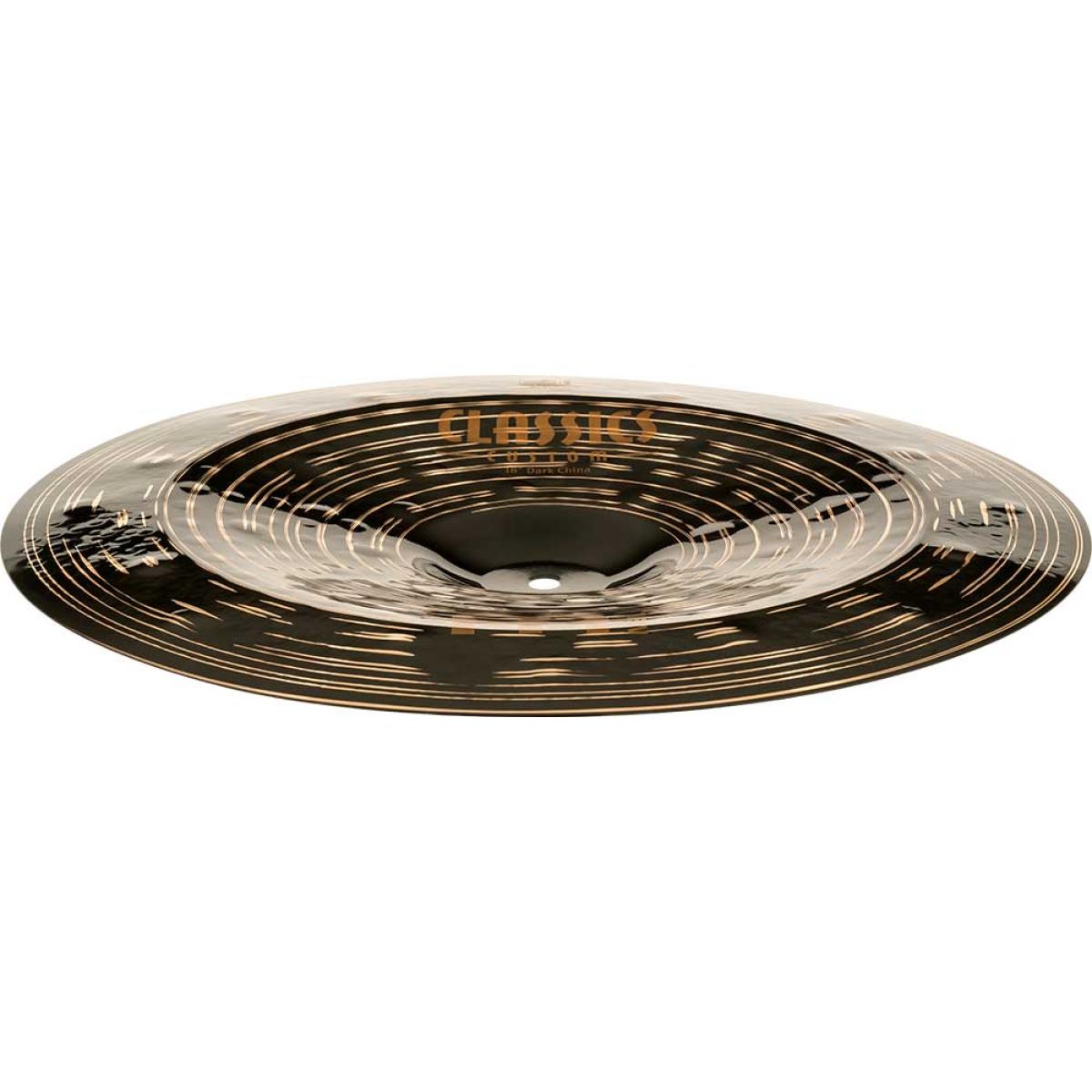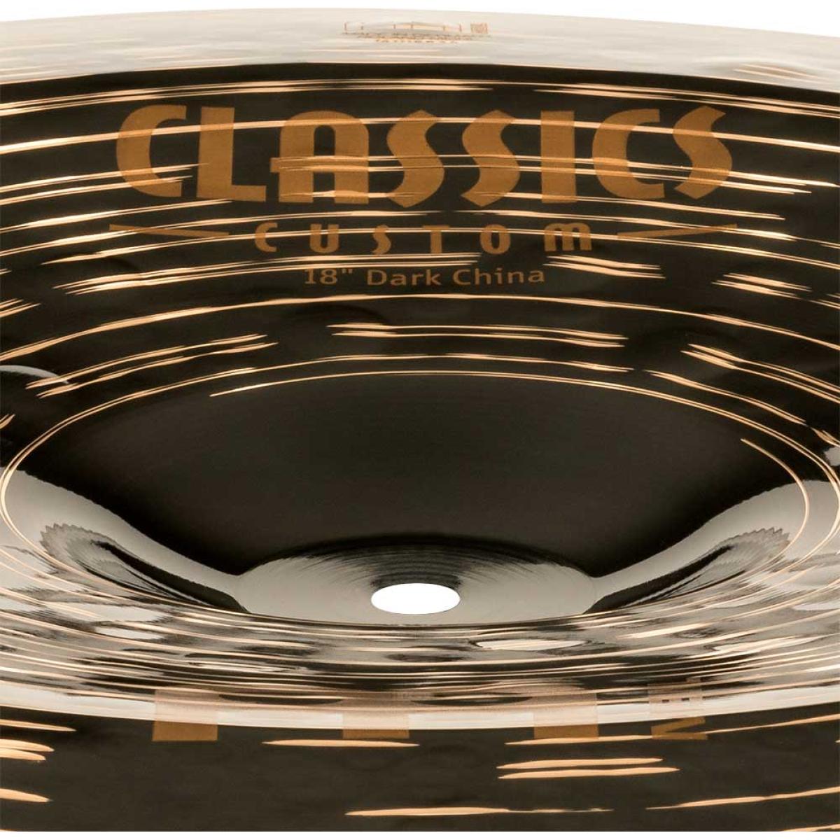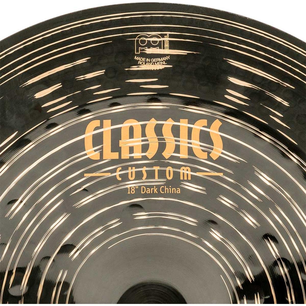 'China 18'' Serie Classics Custom Dark. Los platos la serie Classics Custom Dark se producen mecánicamente en Alemania sobre una aleación B10. En el proceso intervienen varias técnicas, tanto de presión como de martilleado computerizado. Además de ello tiene un acabado negro brillante que les infiere una imagen espectacular y un sonido particular. Características Principales: