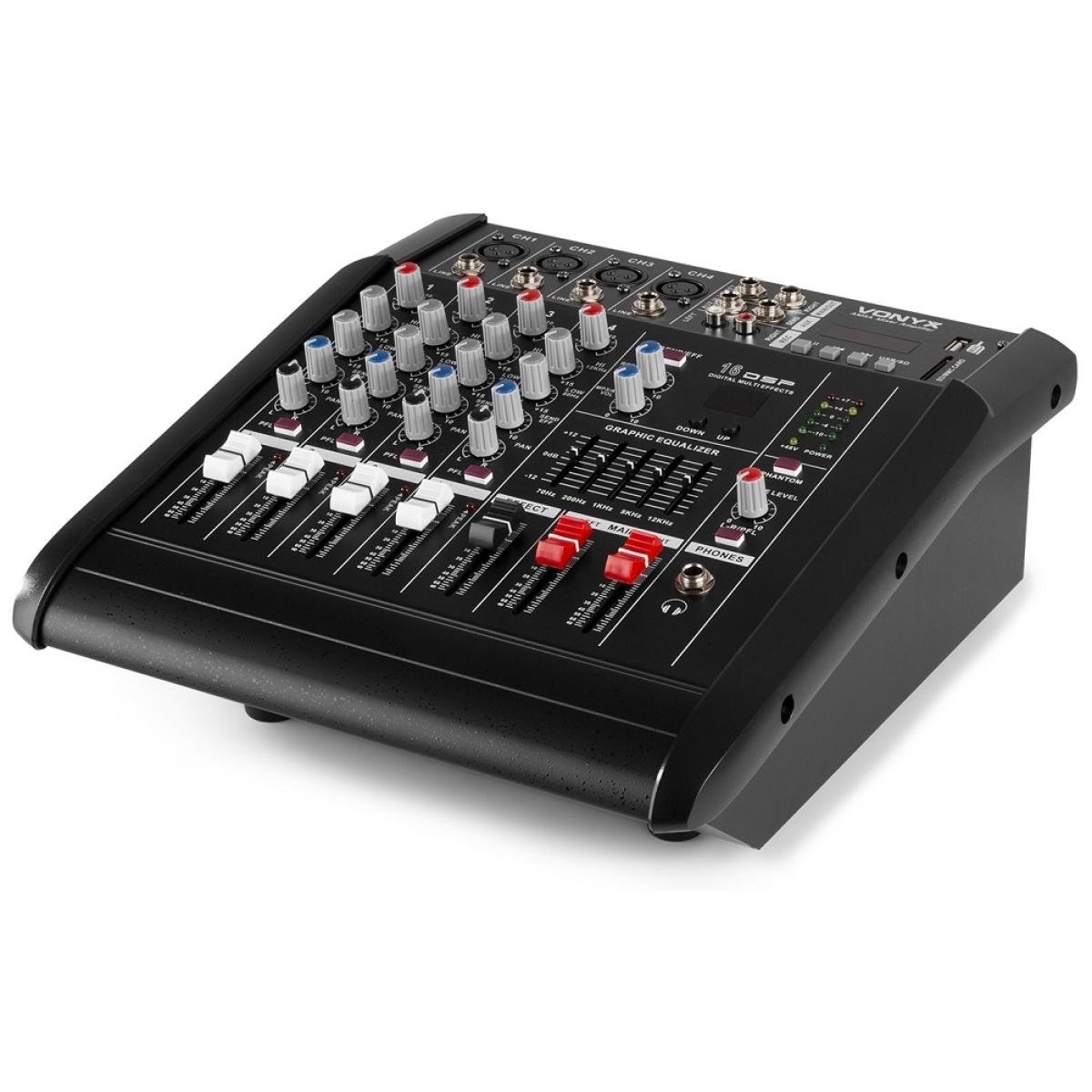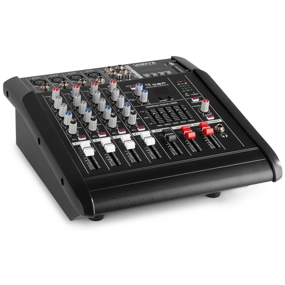 Esta mesa mistura de 5 canais integra um amplificador 2x 500W, oferecendo ao utilizador uma ferramenta básica completa. Com entradas para 4 microfones e linha é ideal para apresentações ao vivo no palco. 16 efeitos digitais dão controle total sobre o som da sala.