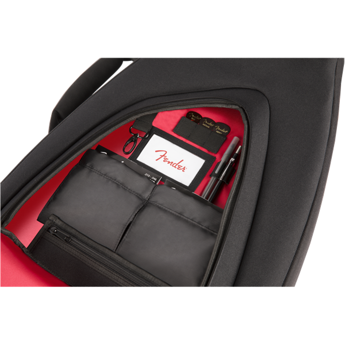 • Bolso de armazenamento frontal com janela para cartão de visita, 2 bolsos para cordões extras, bolsa acolchoada removível para ferramentas, 3 bolsos elásticos para picks, 2 presilhas elásticas para caneta e chaveiro