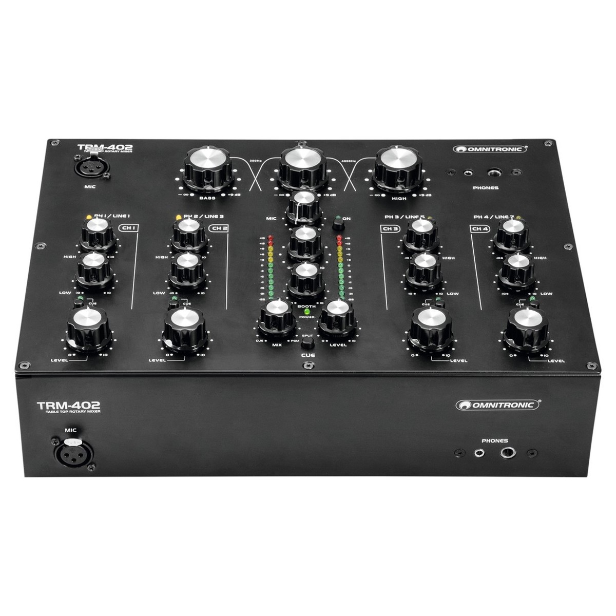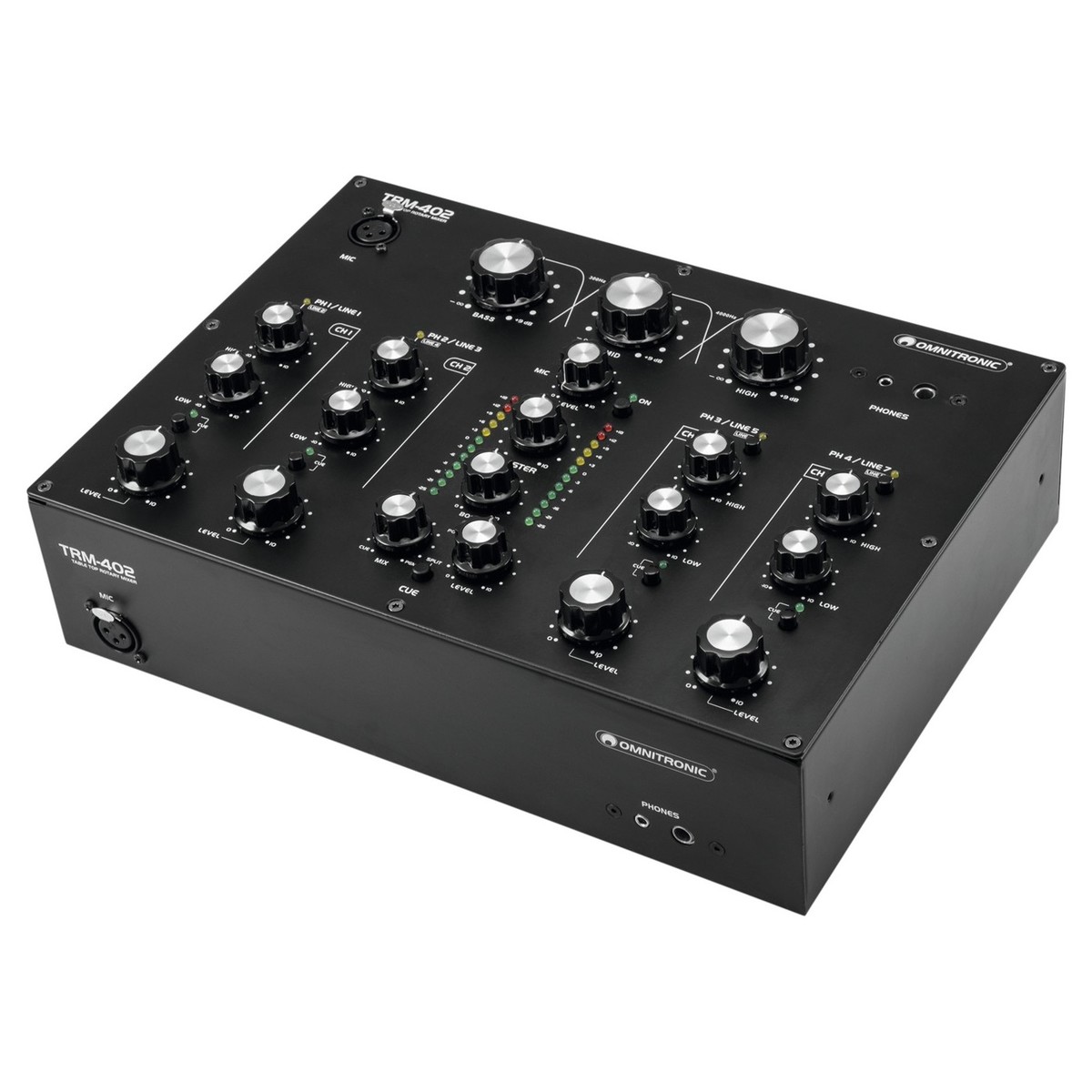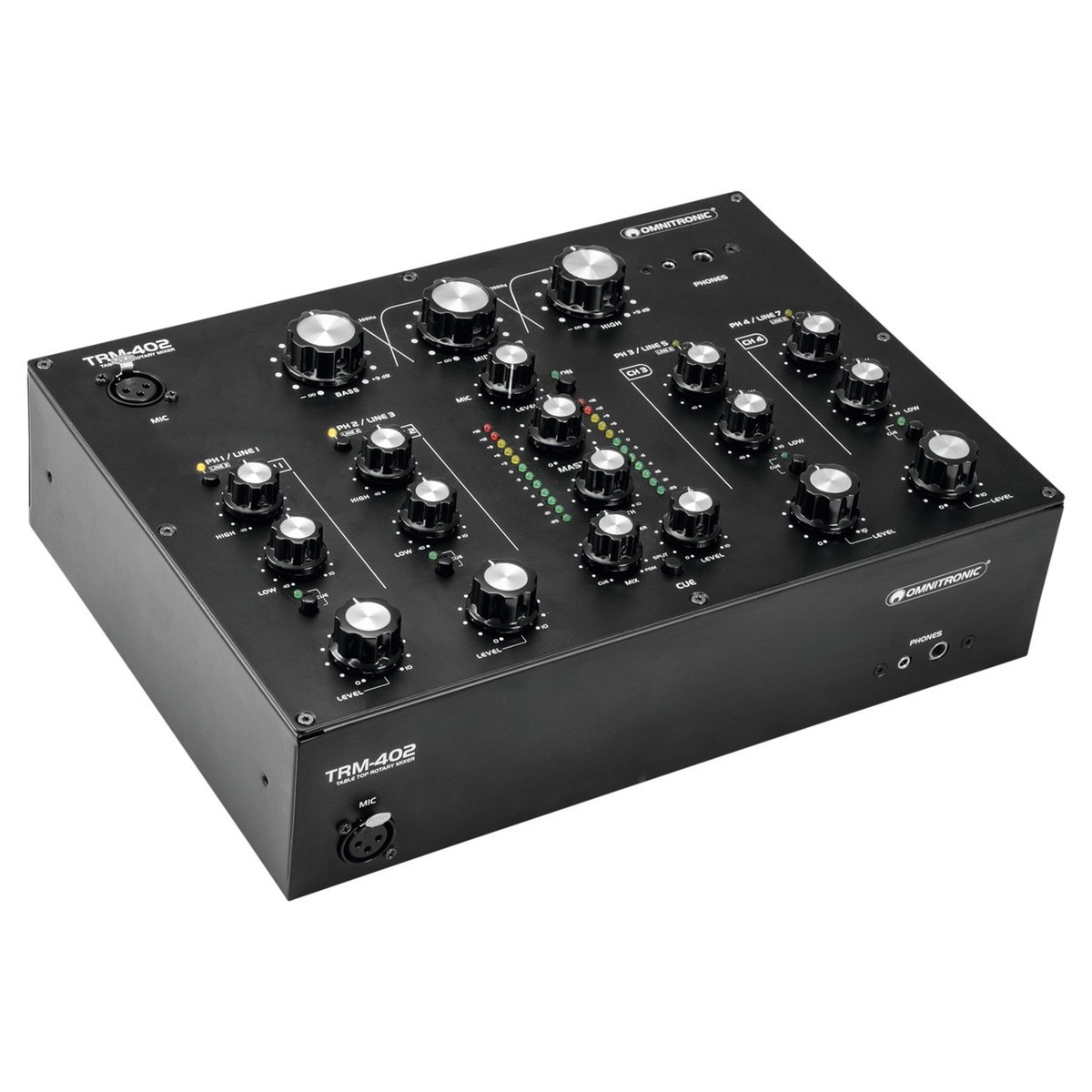 O Misturador Rotativo de 4 Canais Omnitronic TRM-402 Rotary Mixer é um misturador analógico de estilo vintage concebido para DJs. O Misturador Rotativo TRM-402 possui 4 canais no total com equalizador de 2 bandas em cada canal, bem como comutação fono/de linha. Uma das características mais únicas é o isolador de frequência de 3 bandas, que pode ser utilizado para criar transições, misturando entre canções sem problemas.