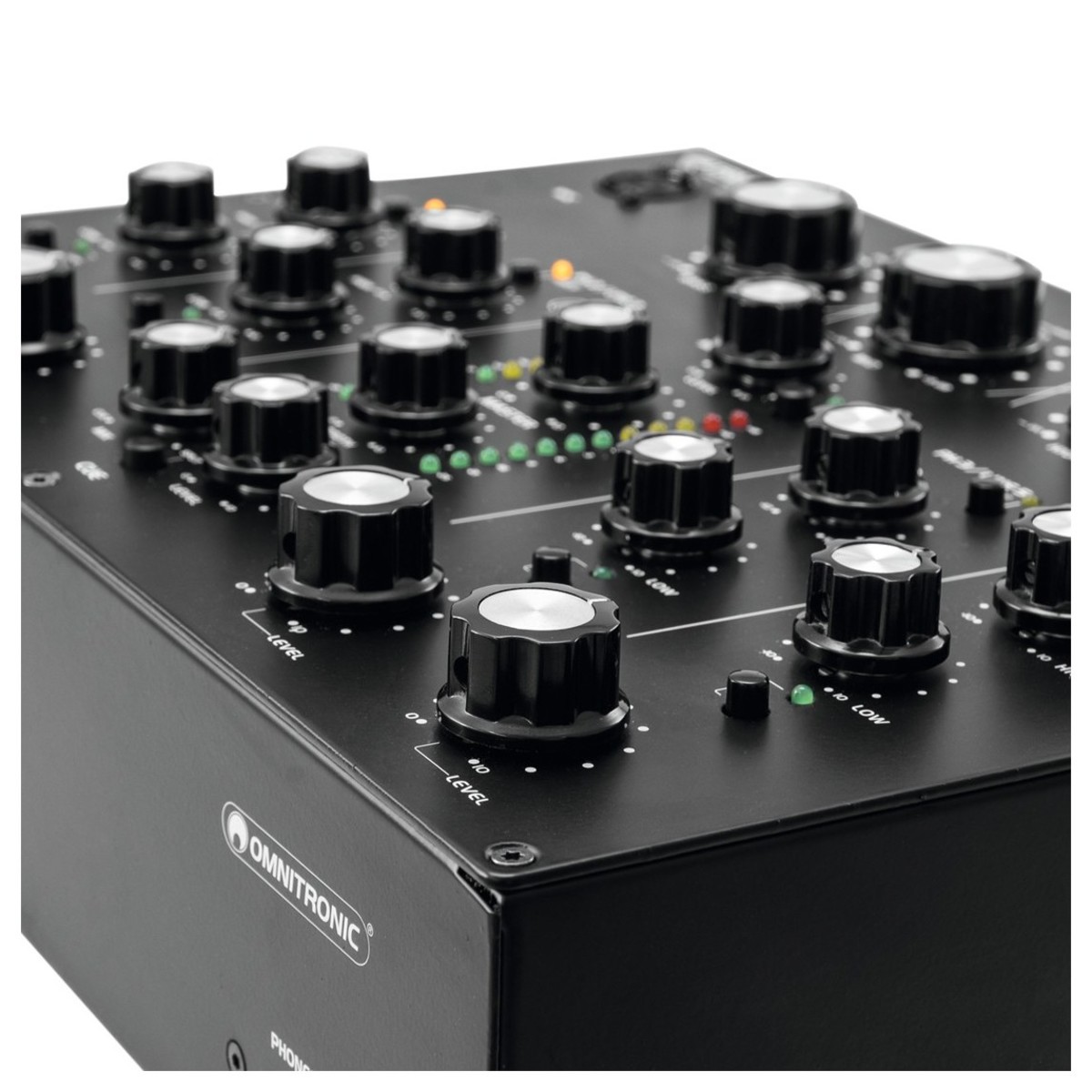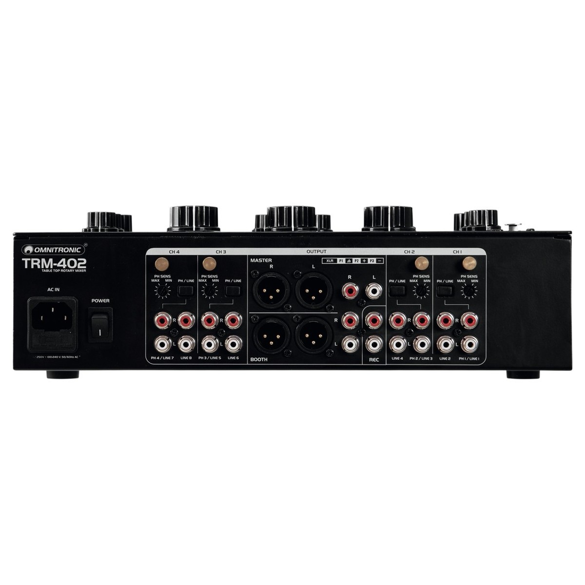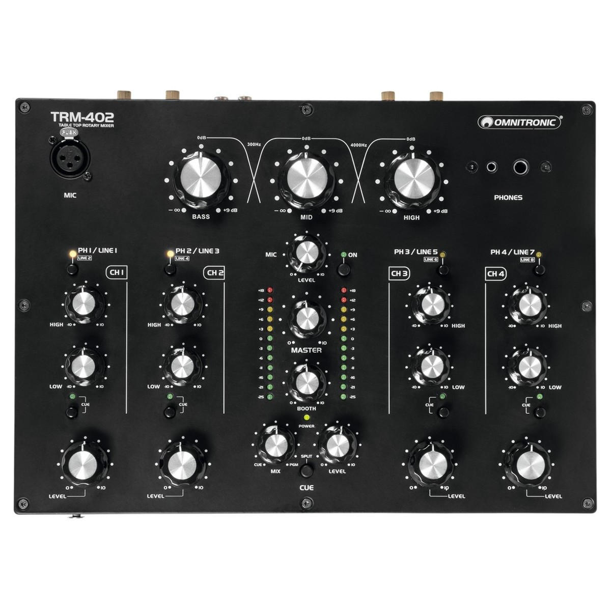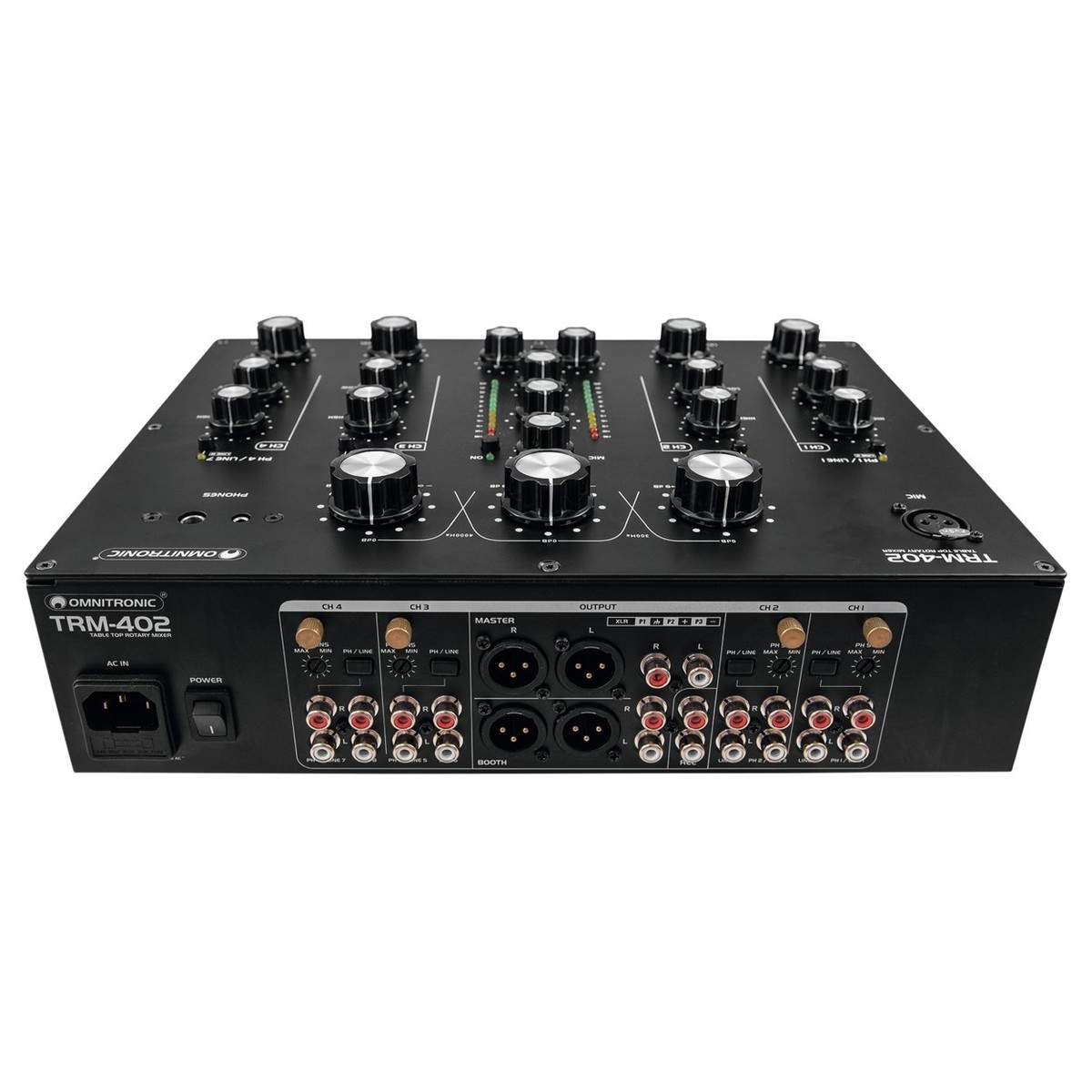 O Misturador Rotativo de 4 Canais Omnitronic TRM-402 Rotary Mixer é um misturador analógico de estilo vintage concebido para DJs. O Misturador Rotativo TRM-402 possui 4 canais no total com equalizador de 2 bandas em cada canal, bem como comutação fono/de linha. Uma das características mais únicas é o isolador de frequência de 3 bandas, que pode ser utilizado para criar transições, misturando entre canções sem problemas.