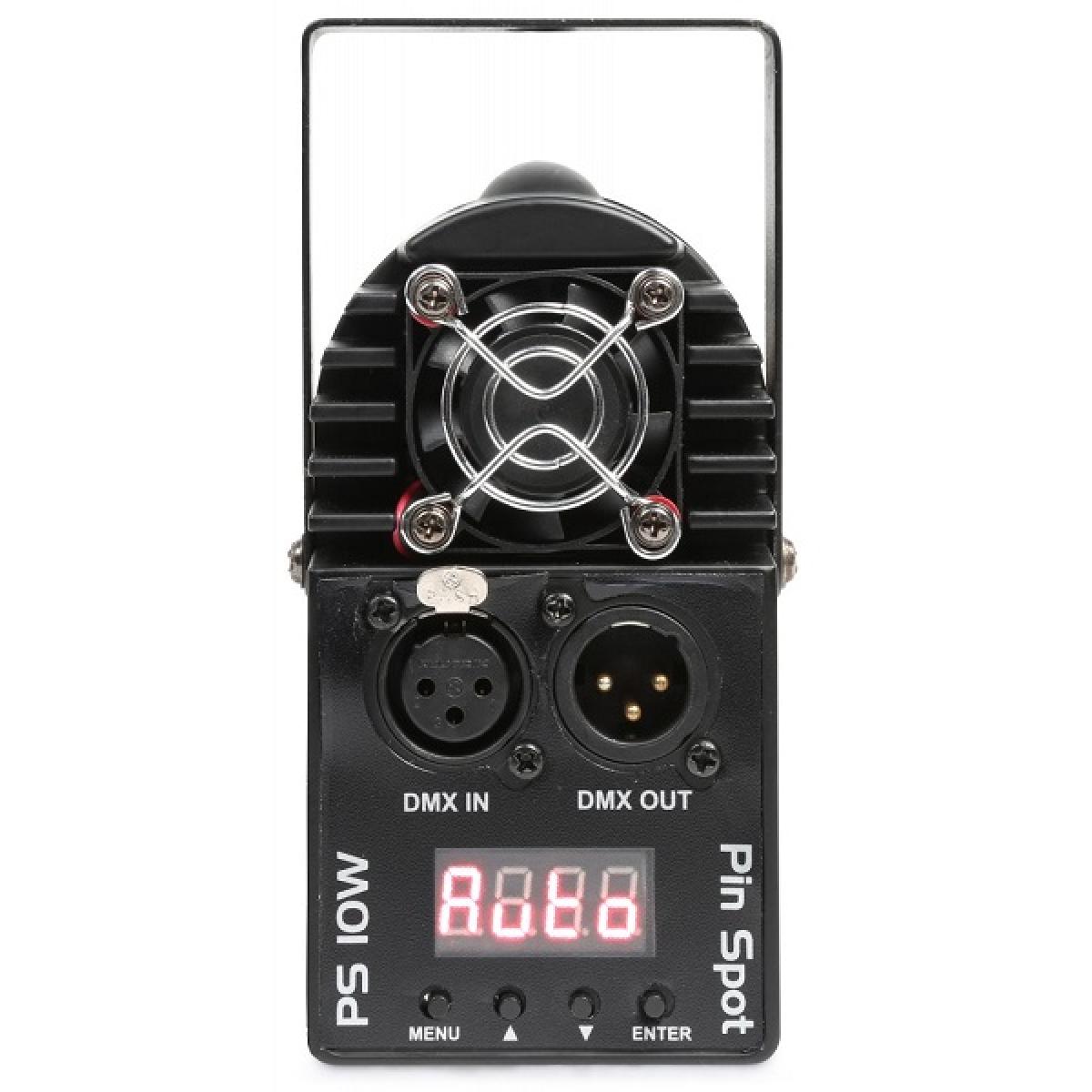 O Foco Pin PS10W utiliza um LED brilhante de 10W 4-en-1. O LED incorpora as cores vermelho, verde, azul e branco. Ao ser de raio estreito é ideal para iluminar bolas de espelho, conseguindo esse efeito de maravilhas quando se reproduz em milhões de reflexos dos espelhos. O foco pode controlar-se por DMX ou modo autonomo em formato ritmo da musica ou auto. Podemos fixar a cor do foco ou trocar sequencialmente o mesmo. Ao ligar de novo o foco se recordará da ultima ordem dada.
