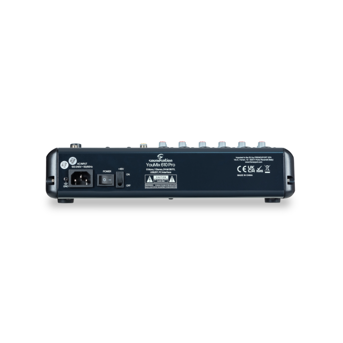 • Silenciamento de canal, solo, equalizador de 3 bandas, envio auxiliar/efeito;