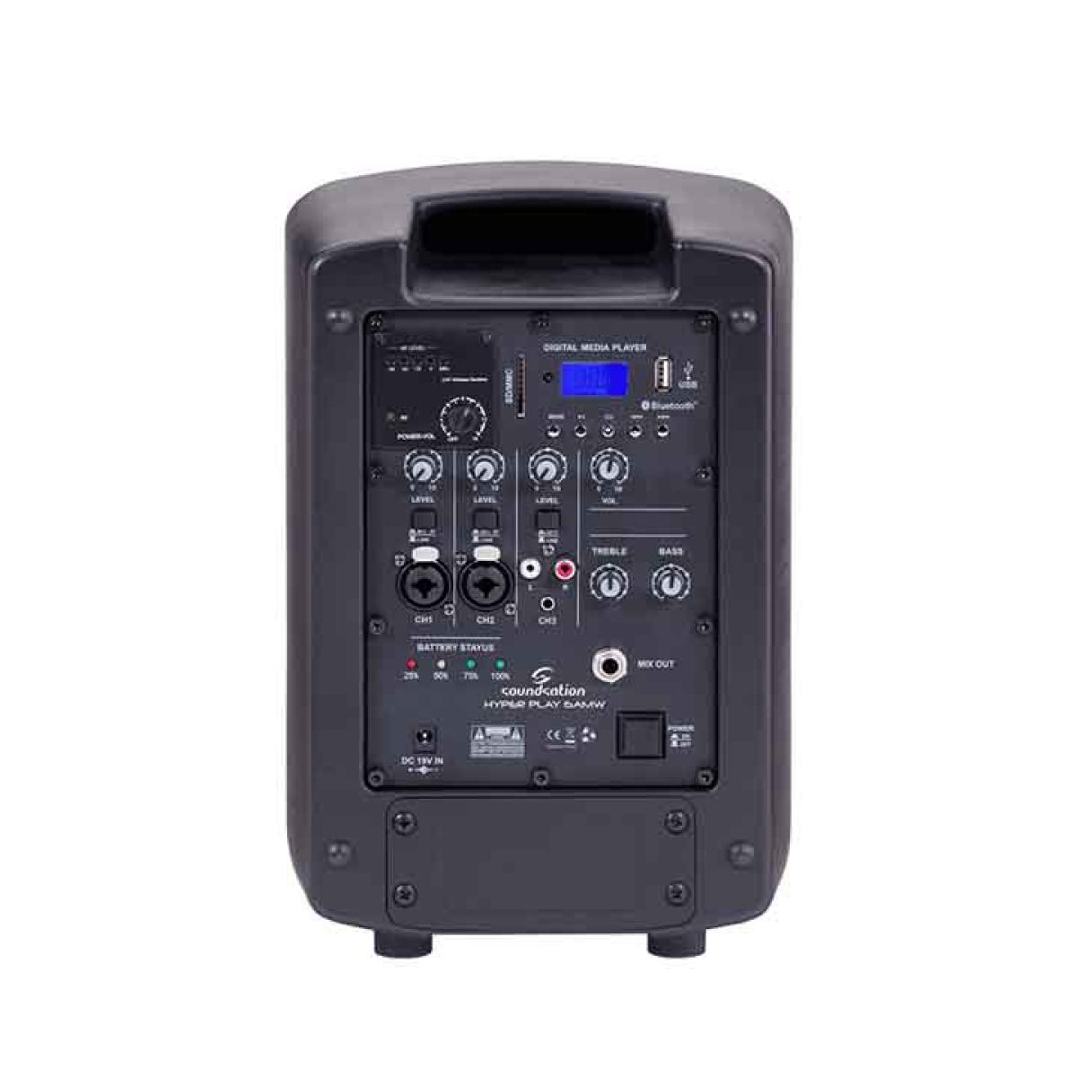 • Possui um mesa de mistura de 4 canais, MP3 player, conexão USB, cartão SD e Bluetooth™, além de microfone UHF profissional sem fio com transmissor portátil. A HYPER PLAY 6AMW funciona com alimentação CA ou por bateria, com duração de aproximadamente 5 horas. ;