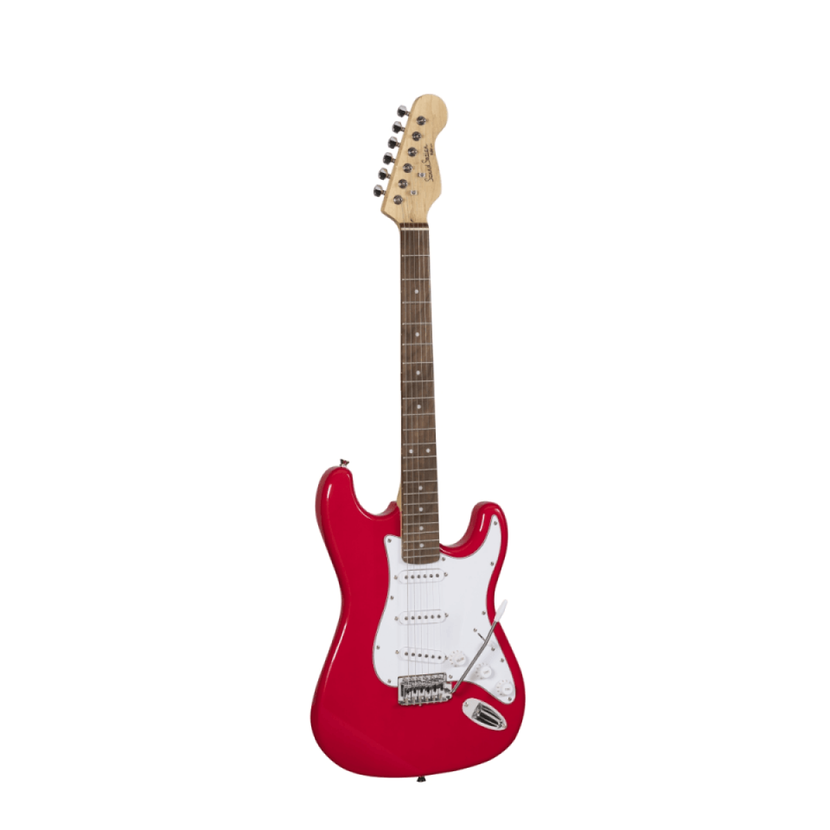 Guitarra elétrica estilo double cutaway com 3 captadores single coil, corpo em basswood e eletrónica versátil, ideal para iniciantes e músicos que procuram som brilhante e equilibrado para vários estilos.