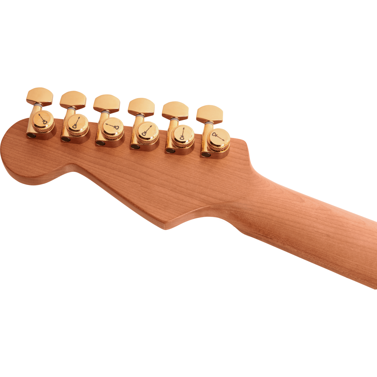 • Escala de 12"-16" de raio composto em maple caramelizado com 24 trastes jumbo e inlays de pontos perlados;