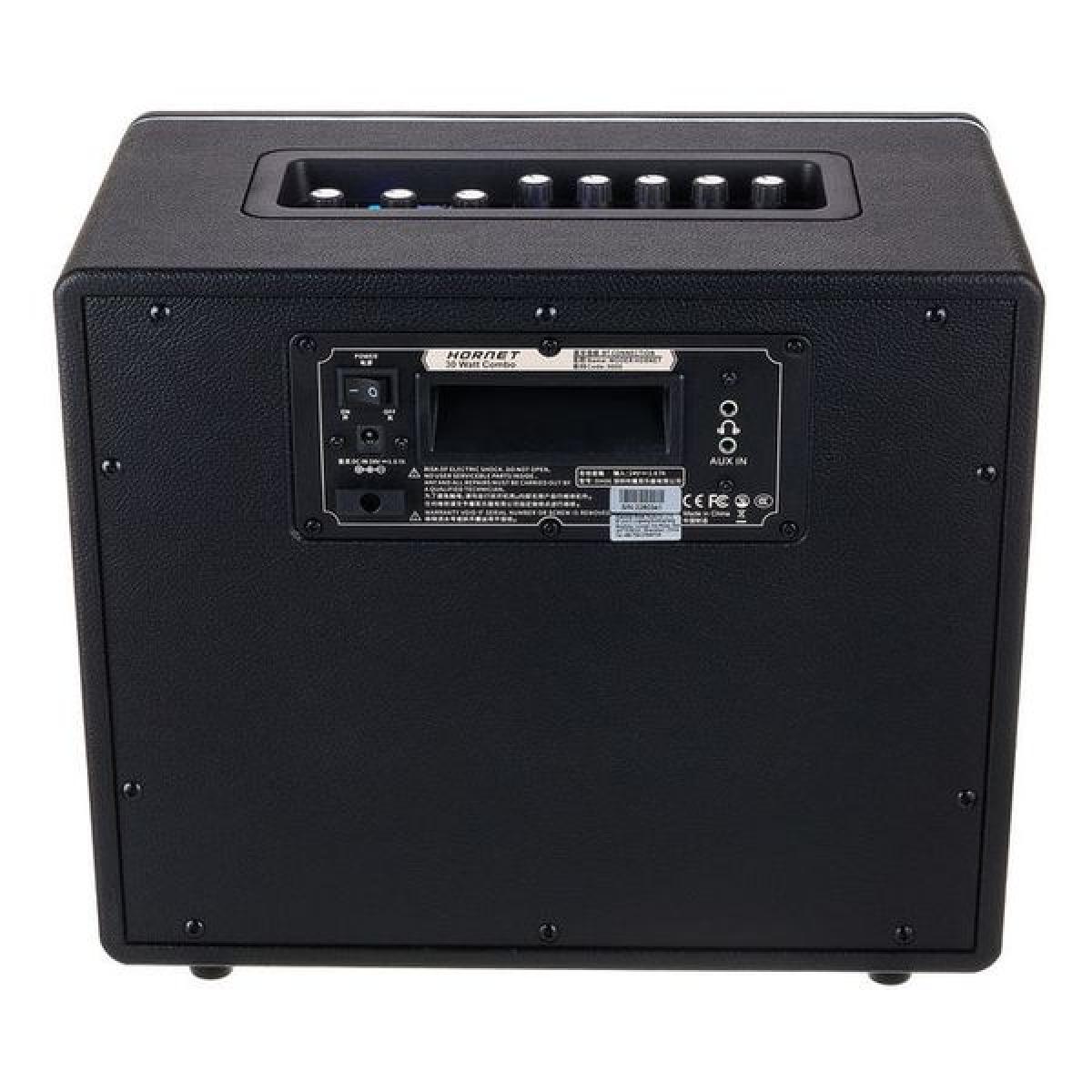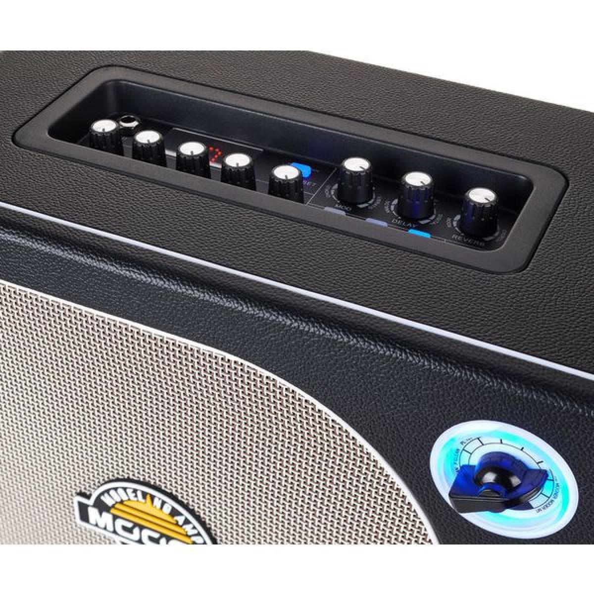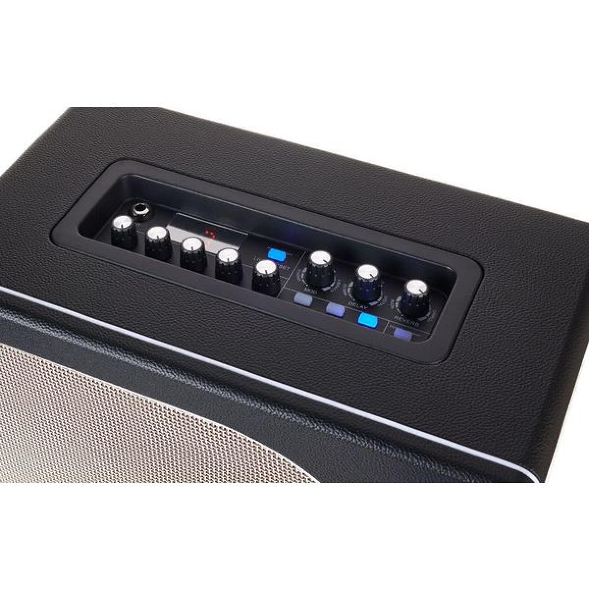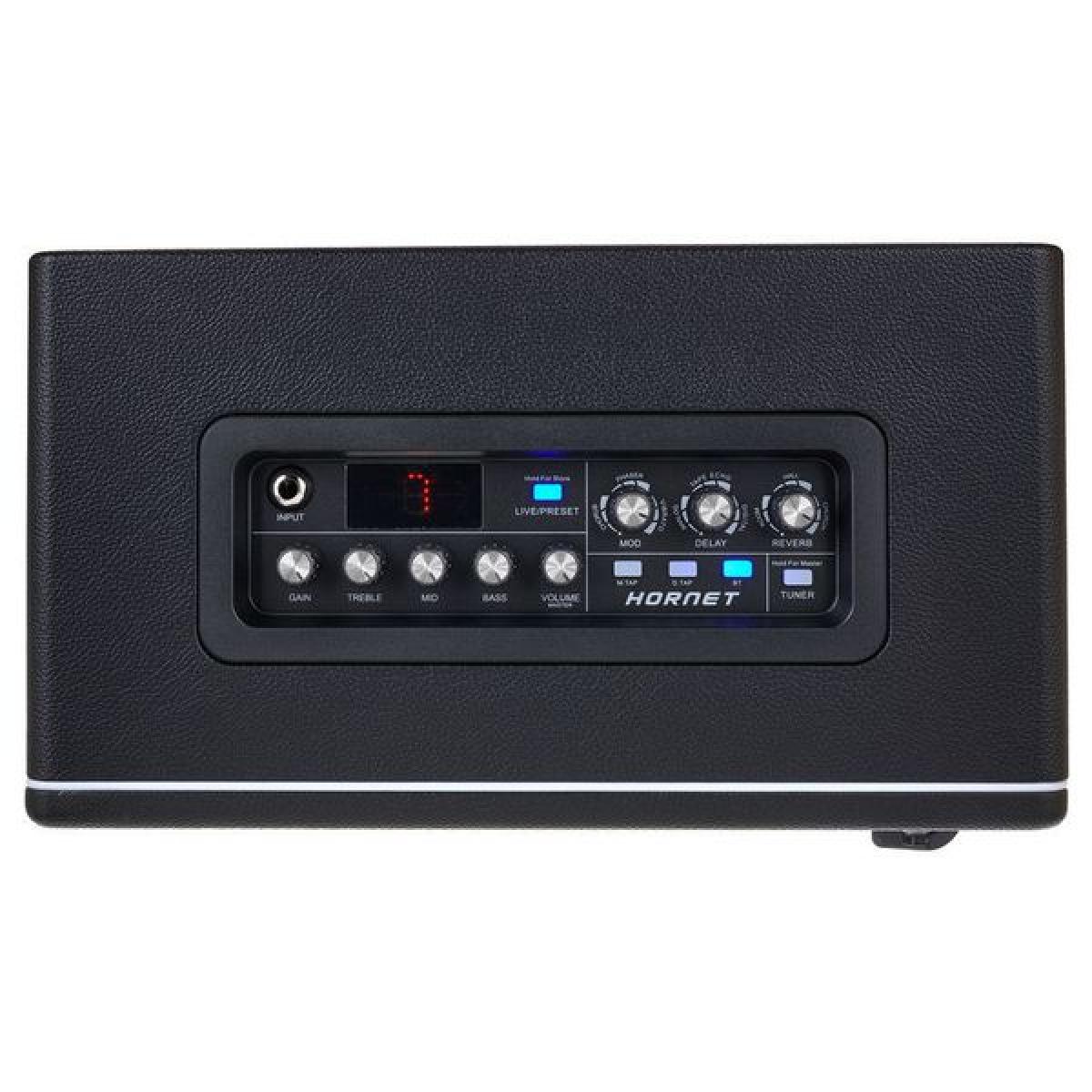 • Controlos para: Ganho, agudos, médios, graves, volume, mod, atraso e reverberação