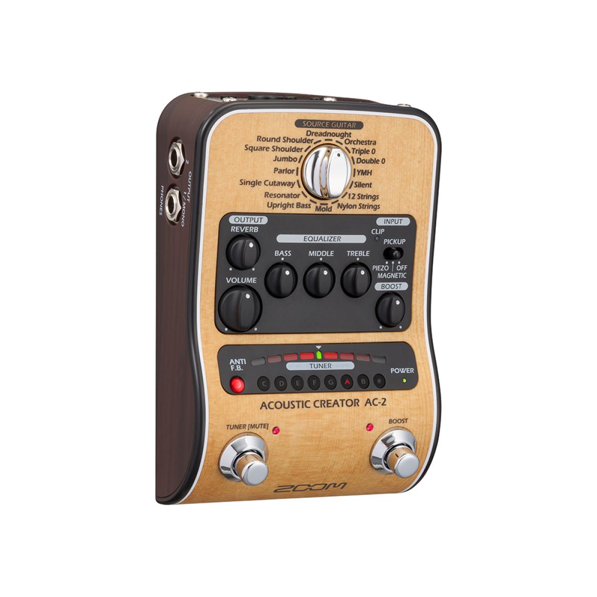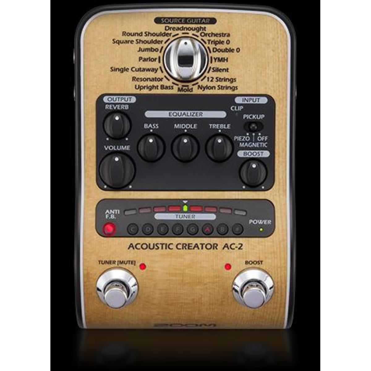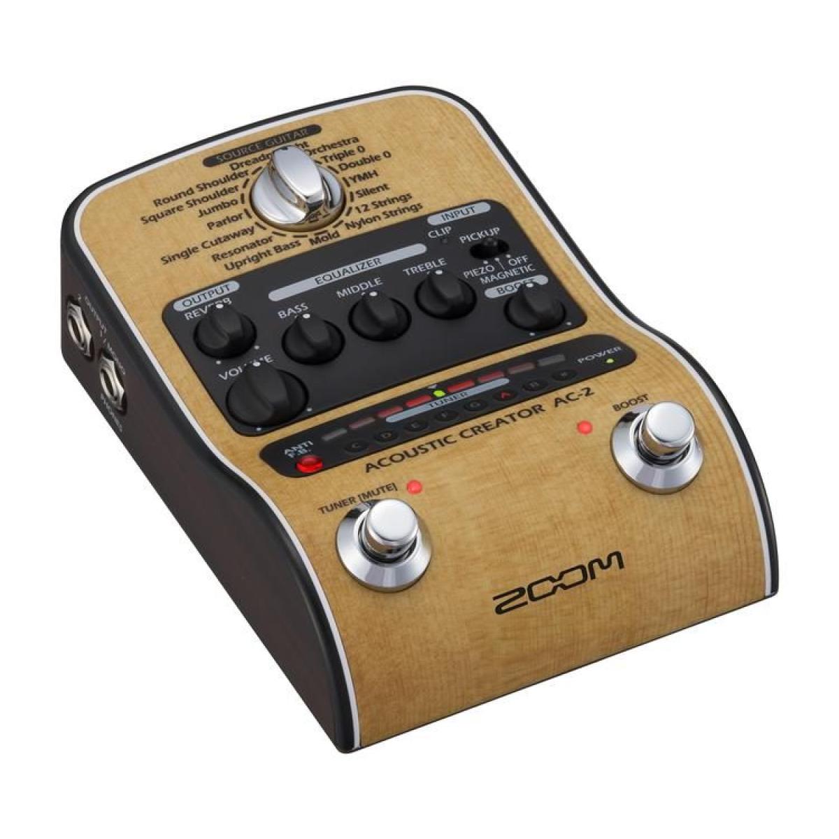 O Pedal Criador Acústico Zoom AC-2 é a unidade ideal para moldar o seu violão no palco ou no estúdio. Estão incluídos 16 modelos de instrumentos de fonte, fornecendo uma resposta personalizada, dependendo do instrumento que você conecta, como vários tipos de violão, guitarra de nylon, contrabaixo e muito mais. O AC-2 atua como pré-amplificador e unidade DI, e pode enviar um sinal aprimorado para amplificadores de guitarra ou um sinal balanceado para uma mesa de mixagem ou dispositivo de gravação. O AC-2 possui um prático tuner embutido com um display LED claro para uso em palco. Um supressor de feedback também é incluído, juntamente com um efeito de reverb, EQ de 3 bandas e um booster para equilibrar os níveis contrastantes resultantes das técnicas de fingerpicking e dedilhar. O design de pré-amplificador e baixo ruído do AC-2 de alta qualidade, as múltiplas opções de potência e o formato elegante do pedal, fazem dele a unidade ideal para uso em palco ou para levar para o estúdio. Isso dará ao seu público o mesmo tom que você está acostumado a ouvir no seu instrumento.