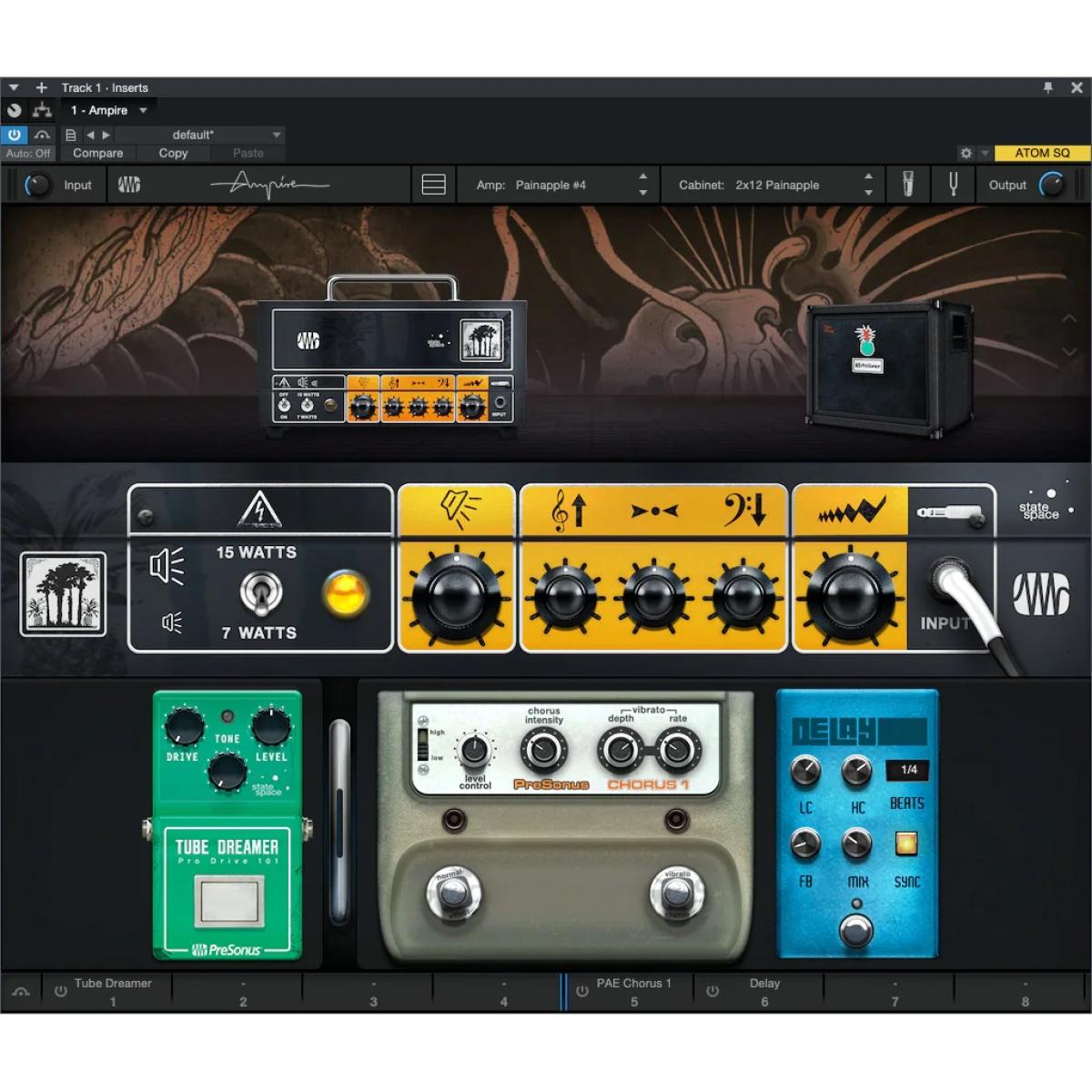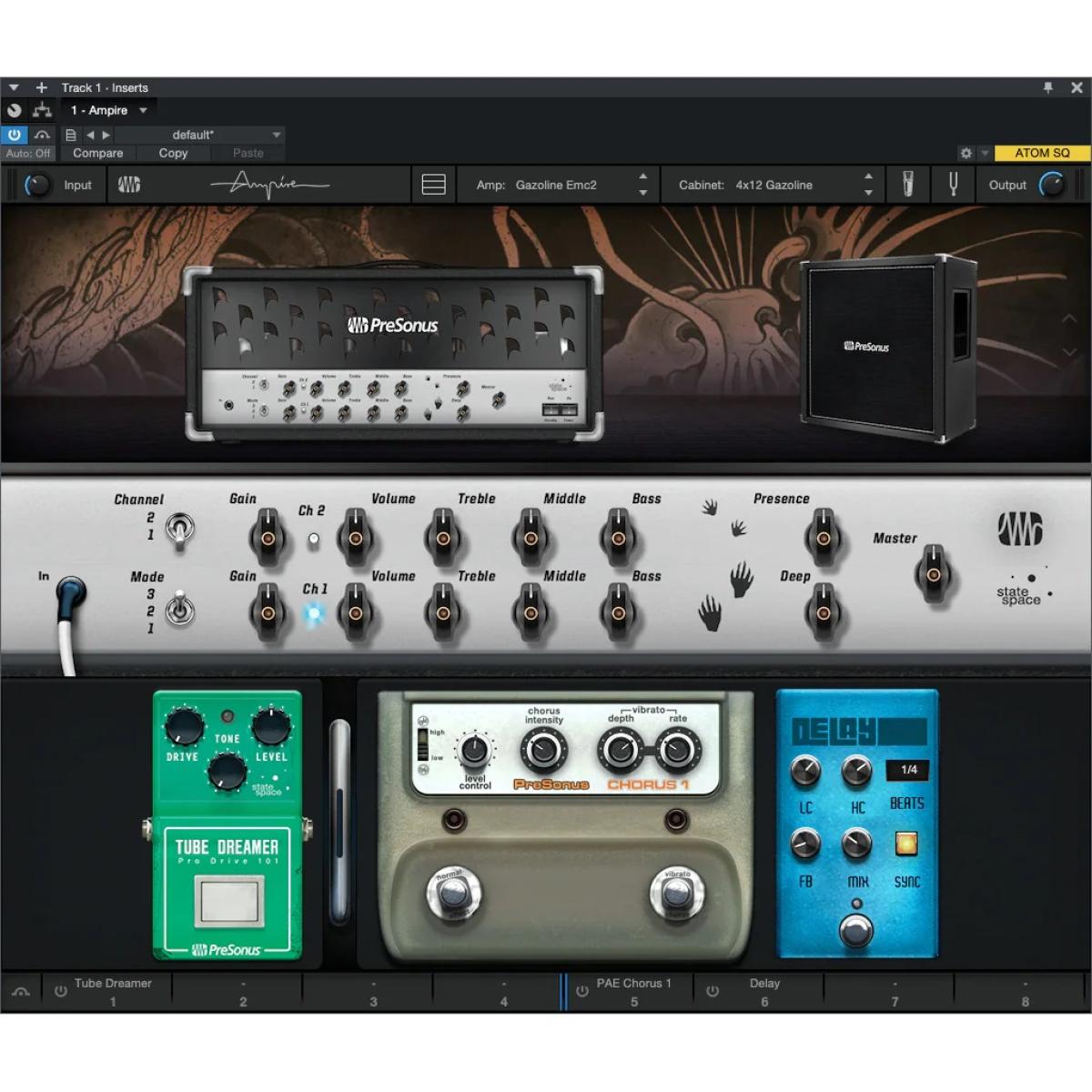 Ampire é o novo simulador de amplificador / gabinete / pedalboard de modelagem State Space da PreSonus incluído no Studio One Professional 4.6 e superior. Você obtém cinco novos modelos de amplificador, 16 emulações de gabinete acústico e um stompbox cheio de efeitos e - uma novidade para PreSonus - disponibilizamos para uso em outros DAWs nos formatos VST3, AAX e AU!
