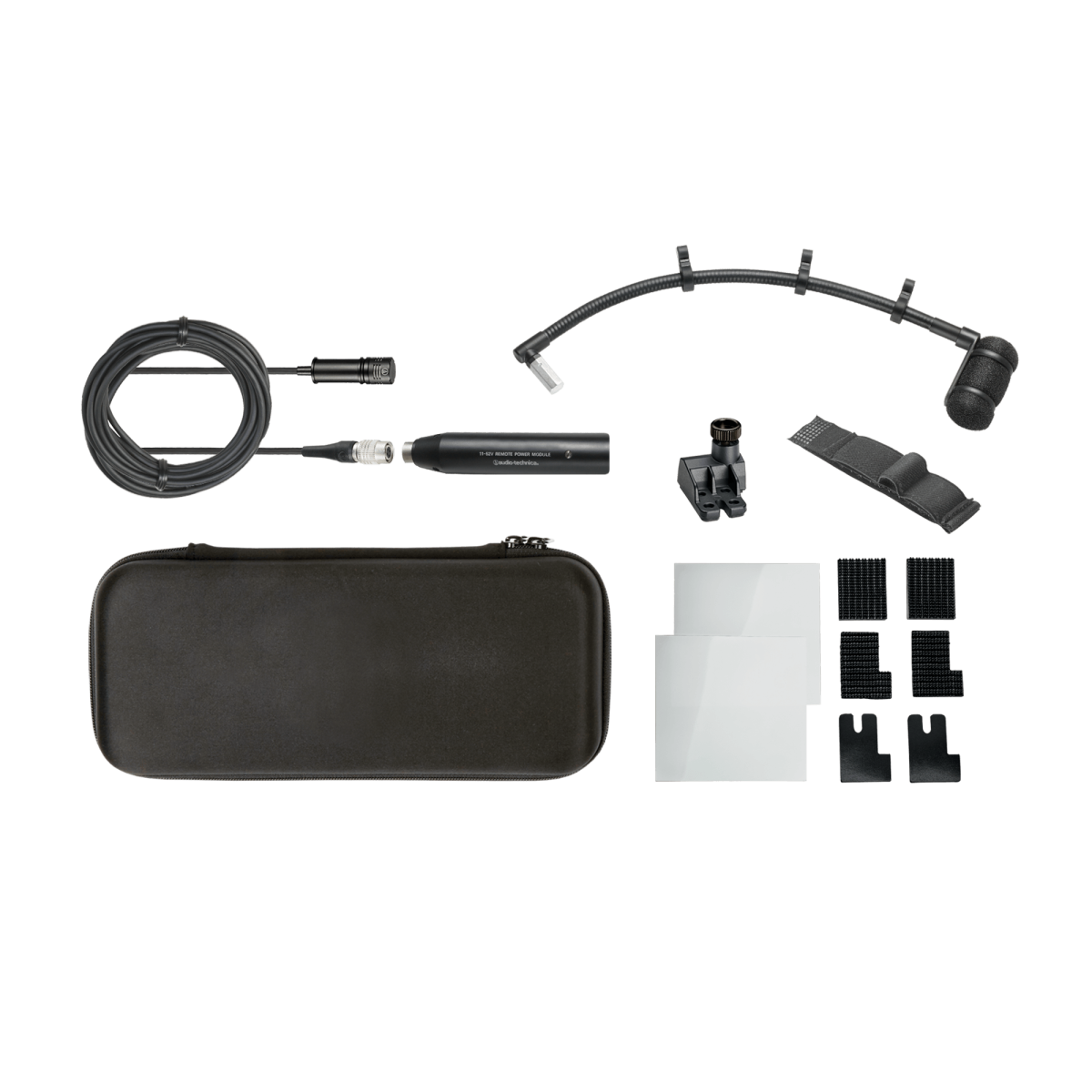 Quando combinado com a montagem de superfície AT8491S incluída e o pescoço de ganso forte e flexível AT8490L de 9 ", o microfone pode ser preso com segurança a um acordeão ou outro instrumento com uma superfície de montagem desafiadora e posicionado onde você quiser - o microfone permanecerá no lugar, não importa o quanto você move o instrumento enquanto toca. O padrão polar cardióide do microfone isola o instrumento reduzindo a captação lateral e traseira, e o filtro passa-alta selecionável de 80 Hz no módulo de energia em linha ajuda a controlar o ruído de baixa frequência indesejado O sistema também inclui um suporte para violino AT8468 com velcro e um estojo de proteção para transporte.