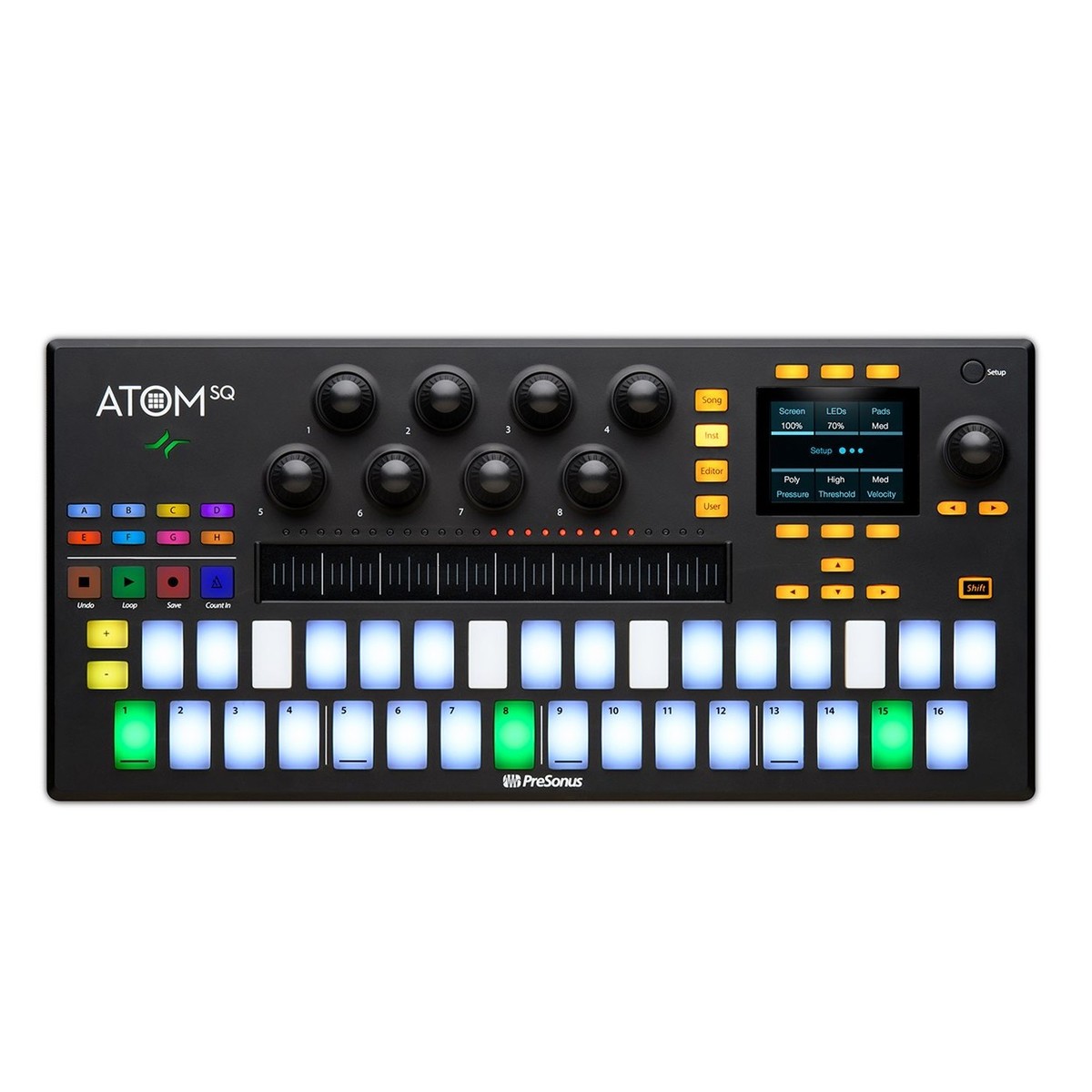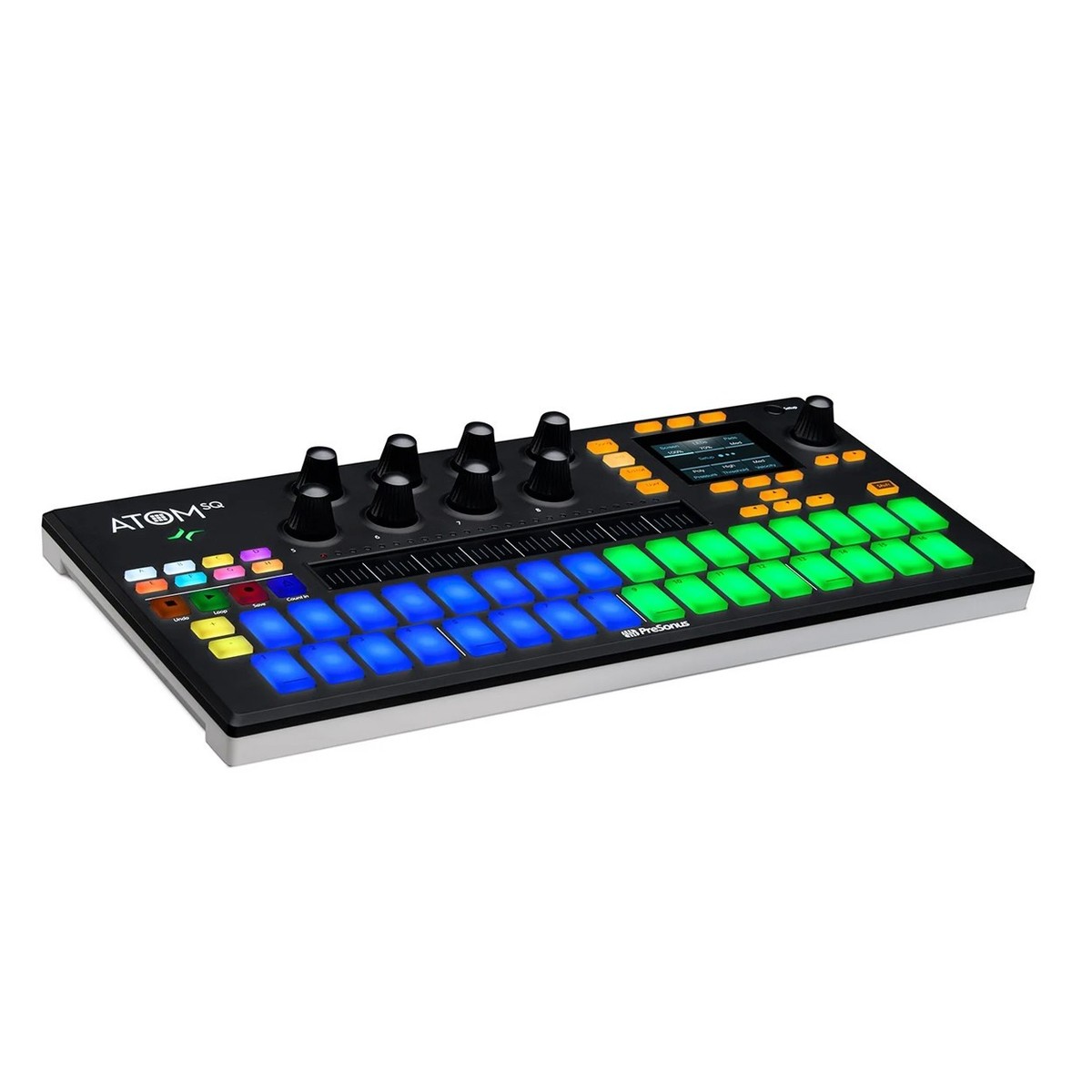 Fazer música nunca foi tão fácil. O ATOM SQ é altamente personalizável. Cada parâmetro pode ser ajustado como desejar. Isso o torna incrível para programar bateria e percussão. Cada um dos oito codificadores rotativos pode controlar cada aspeto, desde a filtragem, passagem e até mesmo ajuste. Você pode até codificar por cor os LEDs RGB conforme achar necessário. Seja para apelo estético ou para aprimorar seu fluxo de trabalho. Tudo é possível graças ao PreSonus .