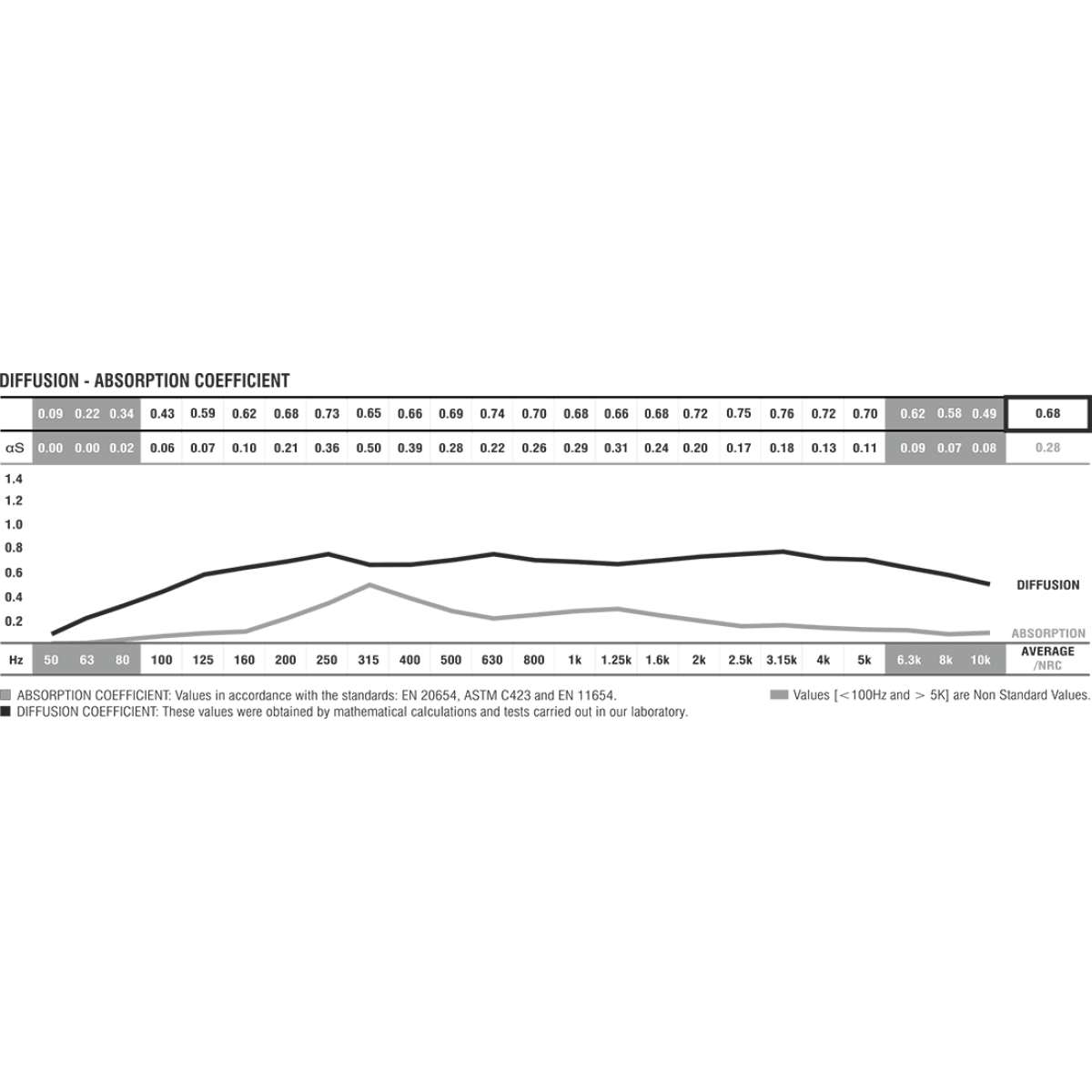 • A base de cálculo foi a relação numérica teórica da raiz primitiva, proporcionando assim excelentes resultados de difusão sonora em todas as direções. O fator de profundidade é variado logaritmicamente, sendo, portanto, um painel de reflexão omnidirecional tridimensional. Devido à sua forma bastante sinuosa com recessos profundos, bem como à matéria-prima de que é feito, este produto também tem um coeficiente de absorção associado considerável. ;