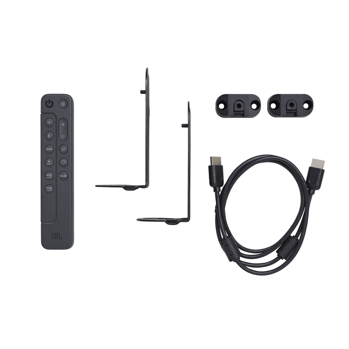 • Kit de 2 suportes de montagem na parede em forma de L (barra principal) + 2 suportes de montagem na parede em forma de U (para colunas surround) com parafusos ;