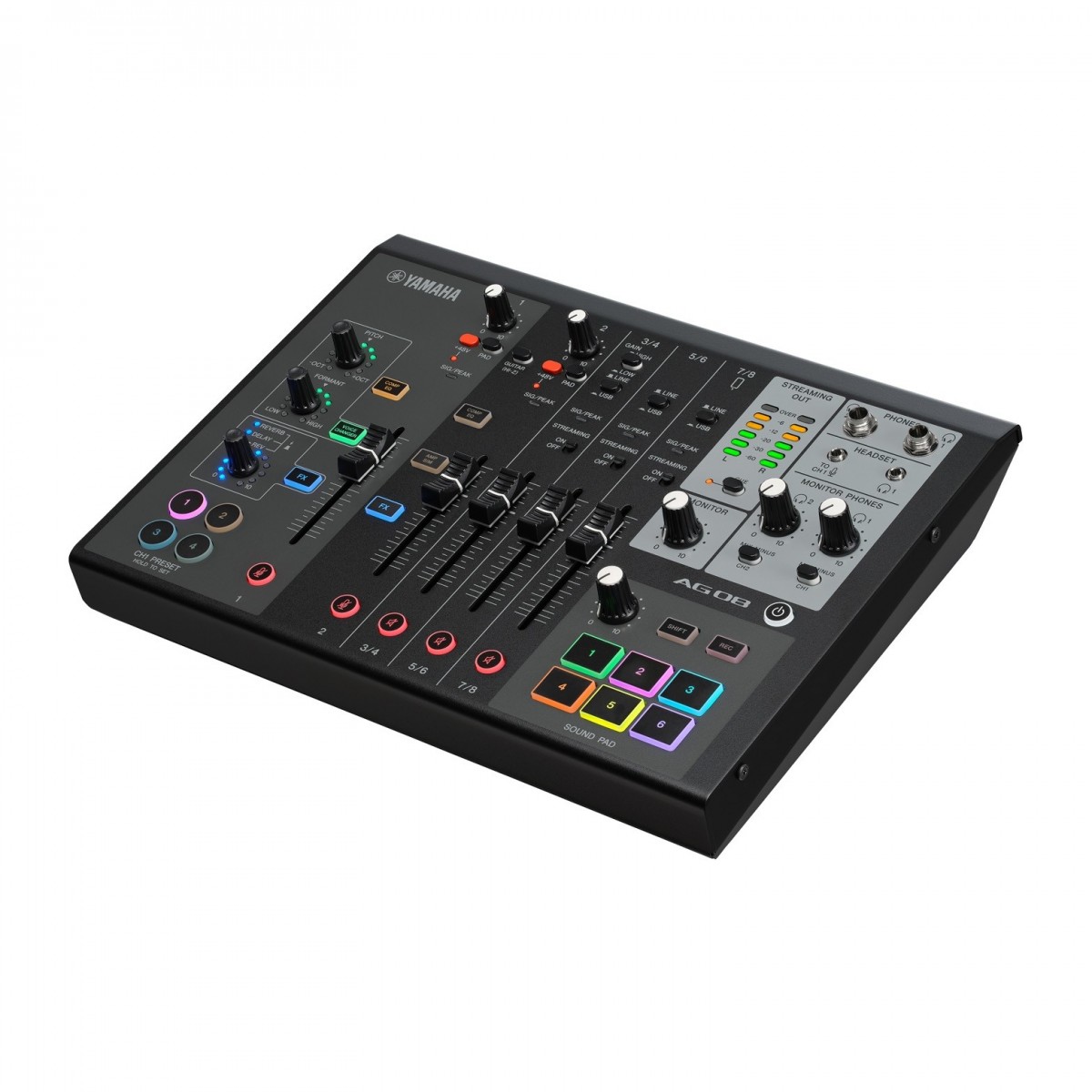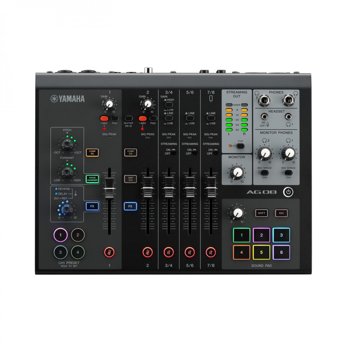 Carregado de efeitos e funcionalidade extra, este misturador de streaming proporciona compressão em ambos os canais de microfone, efeitos de mudança de voz com controlo sobre o tom e formador, EQ, e reverb e delay para ajudar a definir os seus sons. Há também um simulador de amplificador no canal 2 que lhe dará um som autêntico para baixo e guitarra. Todos estes efeitos vêm com quatro ranhuras pré-definidas para guardar, chamar, e carregar num instante. O AG08 também fornece seis sons atribuíveis pads para lançar efeitos sonoros pré-gravados, aparados exactamente para onde os quiser.