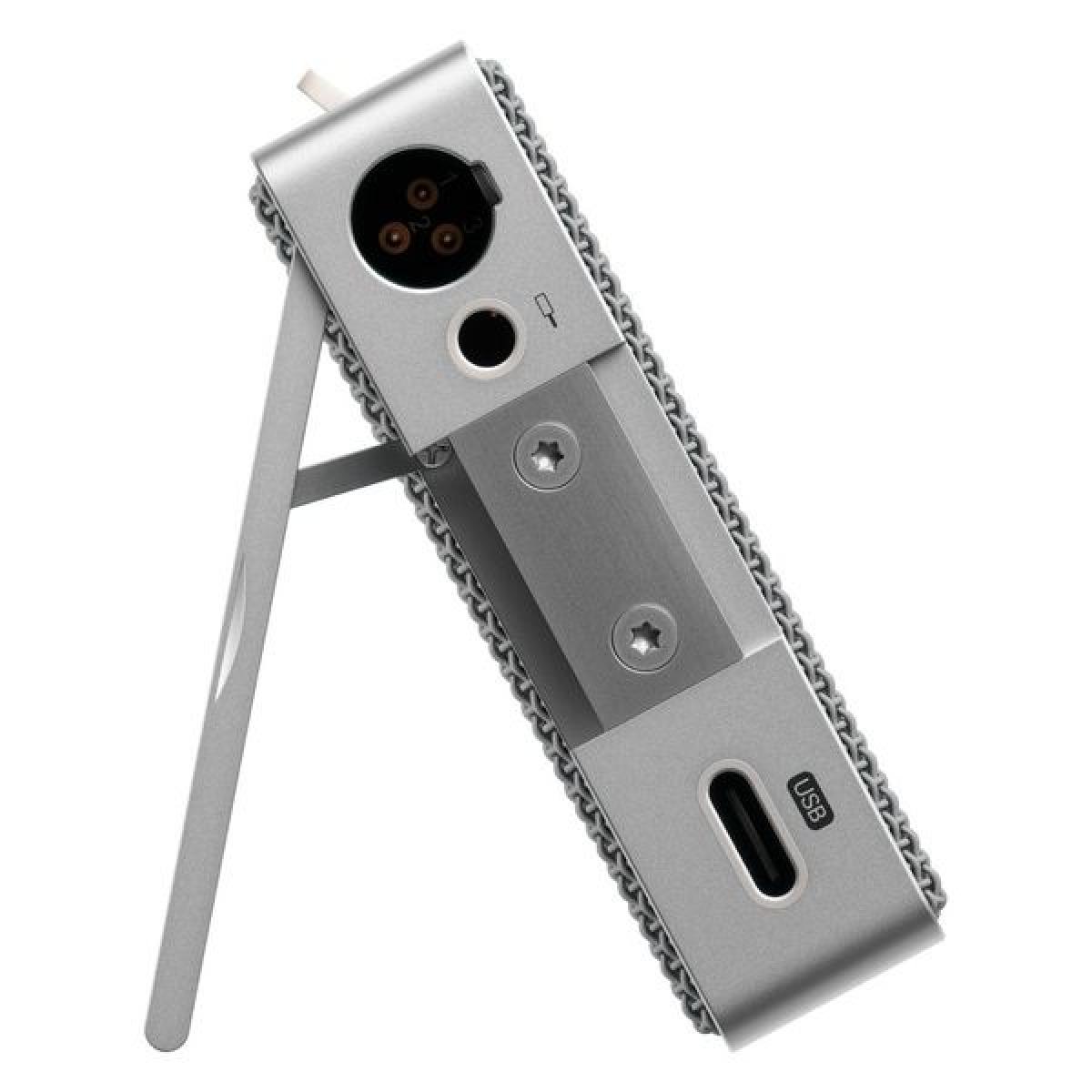 • Pode ser utilizado de 3 formas diferentes: Como um microfone clássico através de XLR (requer alimentação fantasma de 48 V), como um microfone USB e como um microfone autónomo com pré-amplificador integrado e saída de nível de linha através de um conetor de 3,5 mm (alimentado pela bateria incorporada)