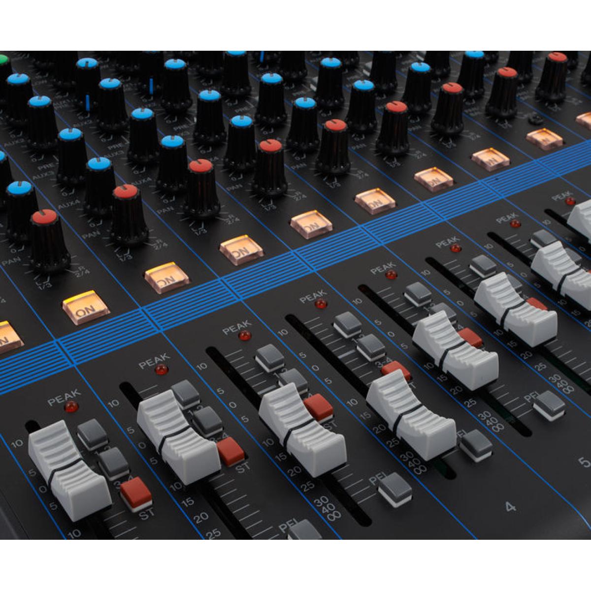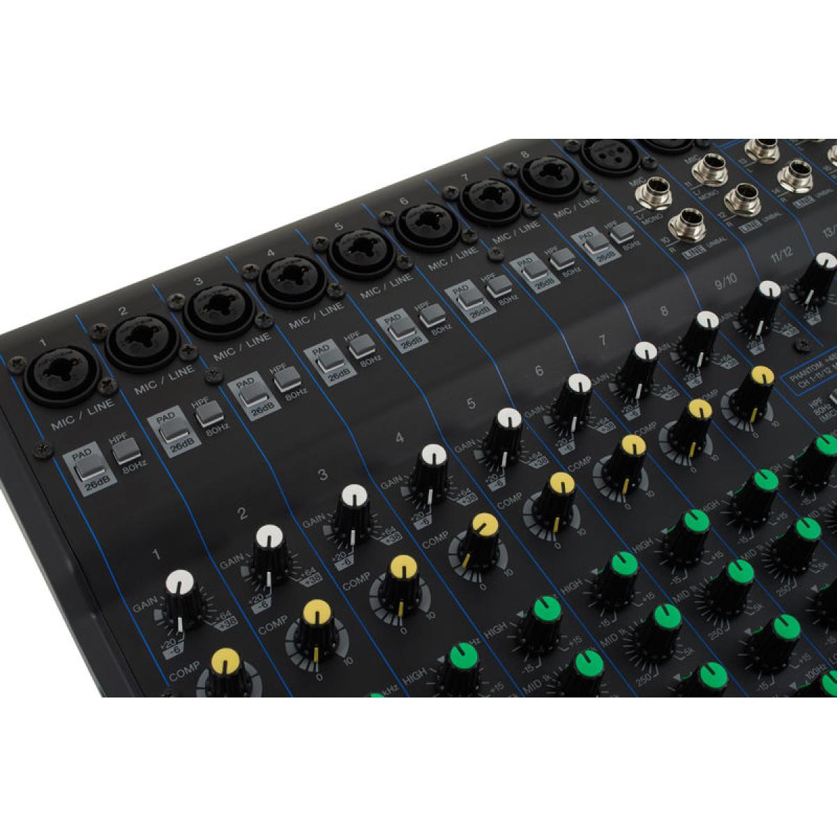 • Entradas: 16, 10 canais de combinação + 2 tomadas estéreo ou 8 canais de combinação + 4 canais de tomada estéreo