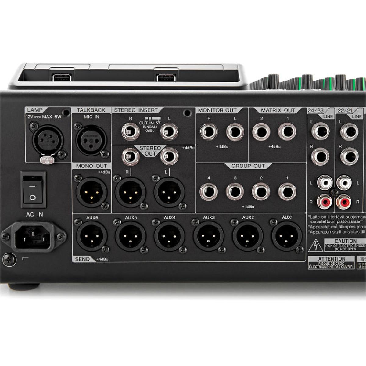 • Ampla conectividade - 6 outs aux, 4 outs de grupo, 2 fx sends, e 2 outs de matriz todos incluídos