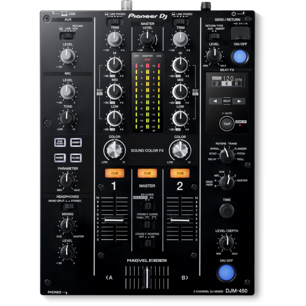 O Pioneer DJM-450 DJ Mixer é uma versão de 2 canais de qualidade premium do Pioneer DJM-900NXS2, baseado no mesmo layout intuitivo, incluindo um processador de sinal digital de 64 bits. O design compacto do DJM-450 o torna ideal para performances live vivo, facilmente ajustáveis em qualquer configuração. Cada canal possui um EQ de três bandas para controle ideal, permitindo que você faça transições sem interrupções entre as mixagens. Você também pode adicionar FX profissional às suas performances usando os controles FX integrados, incluindo: Delay, Eco, Reverb, Flanger, Sweep e muito mais. Além disso, o DJM-450 possui duas saídas de auscultadores, RCAs banhados a ouro e chaves de licença gratuitas para os aplicativos de desempenho profissional da Pioneer, para que você possa reproduzir faixas digitais do seu PC usando toca-discos e vinil de controle.