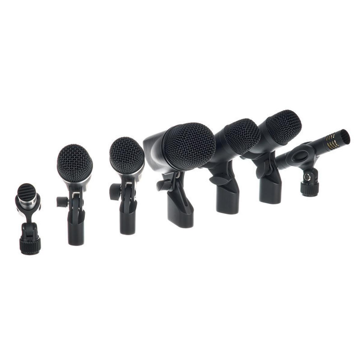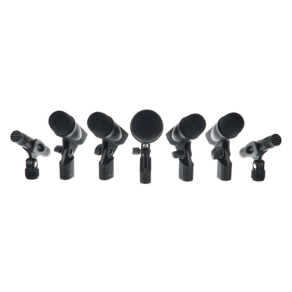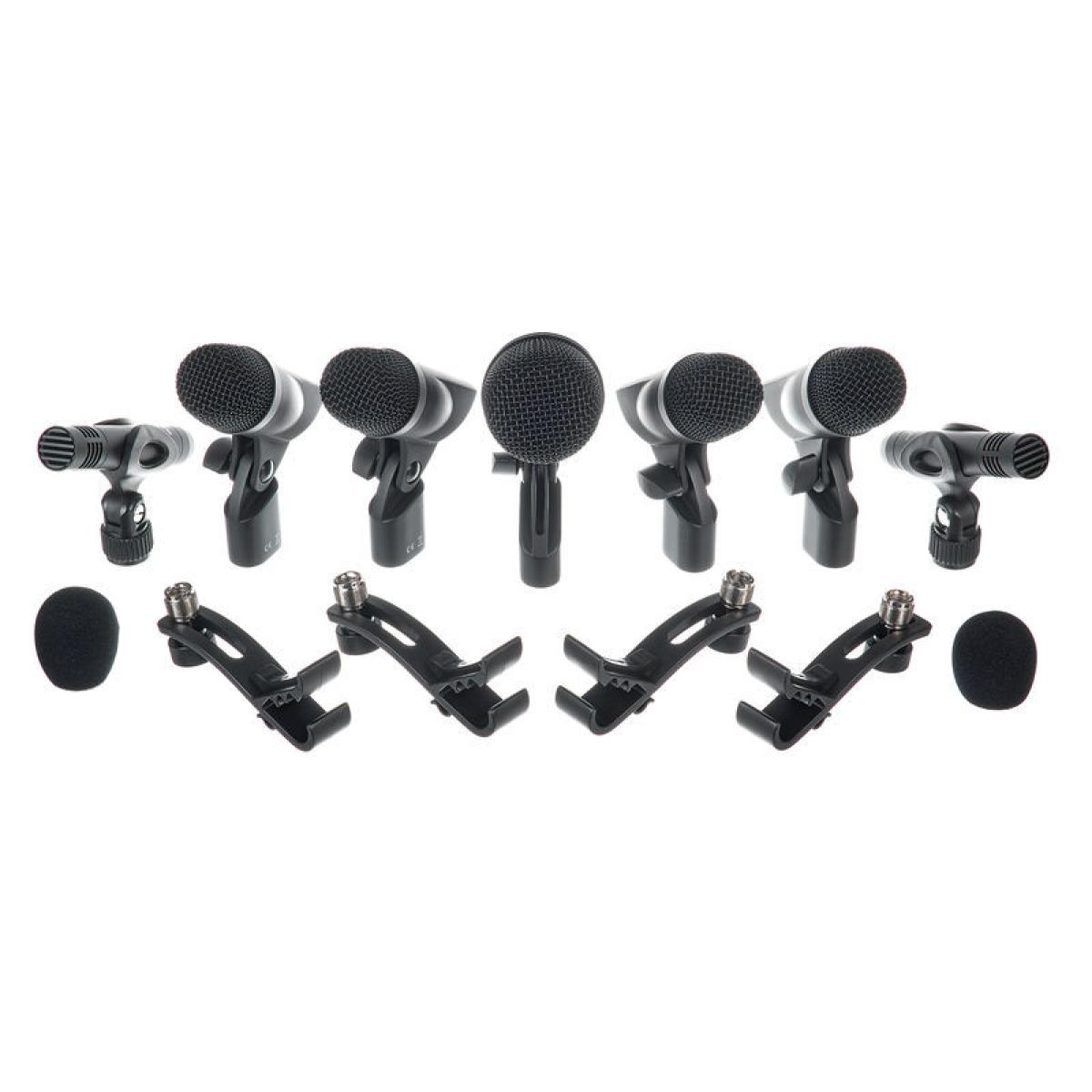• Sete microfones de bateria de qualidade - para bumbo, snare, tons e pratos