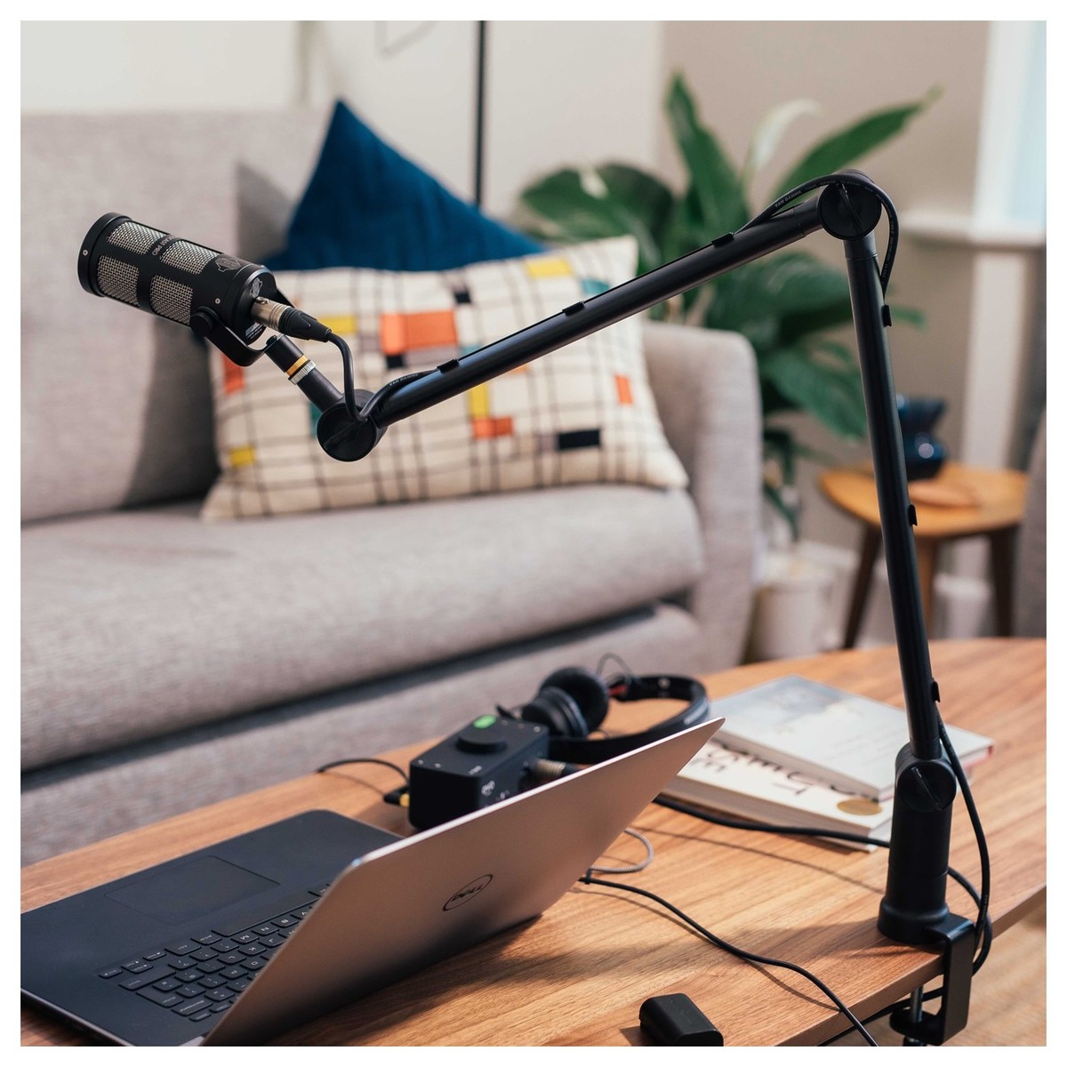 • Braço boom montado em mesa, estilo broadcast para microfones