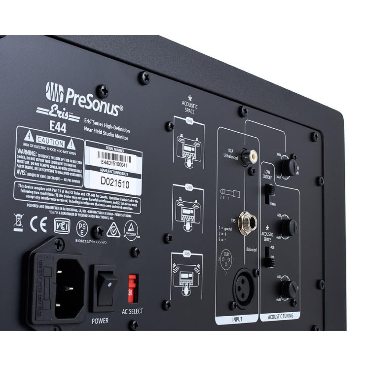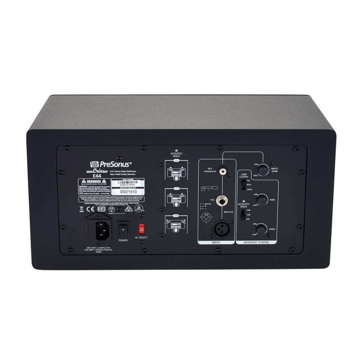 PreSonus entende que nem sempre você será capaz de mixar em um ambiente acusticamente perfeito, por isso incluiu um controle de espaço acústico inovador que atende ao seu ambiente com uma seleção de três modos de operação (0dB, -2 dB, -4dB). Além disso, localizado na parte traseira do monitor Eris E44 está um controle de corte baixo, bem como controles médios e altos para obter um som naturalmente equilibrado, independentemente do ambiente.