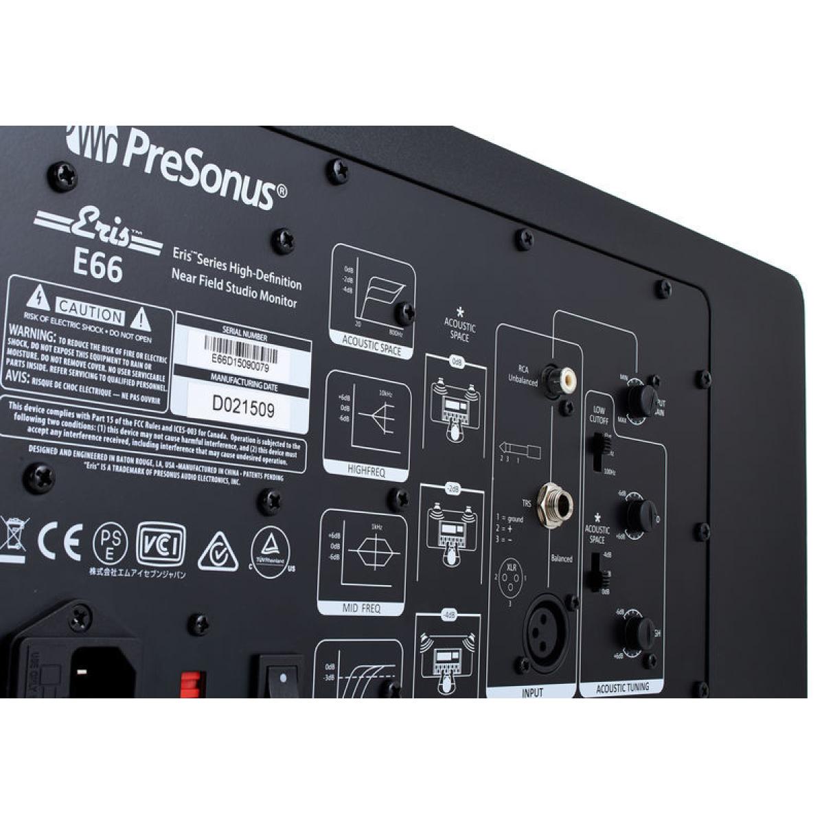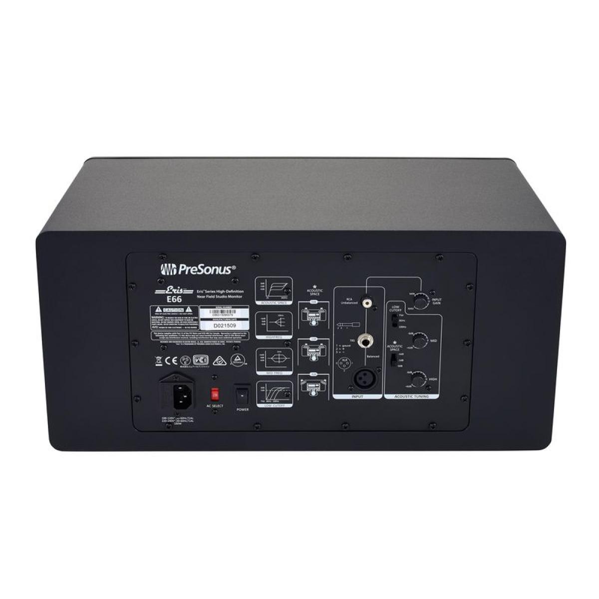 PreSonus entende que nem sempre você será capaz de mixar em um ambiente acusticamente perfeito, por isso incluiu um controle de espaço acústico inovador que atende ao seu ambiente com uma seleção de três modos de operação (0dB, -2 dB, -4dB). Além disso, localizado na parte traseira do monitor Eris E66 está um controle de corte baixo, bem como controles médios e altos para obter um som naturalmente equilibrado, independentemente do ambiente.