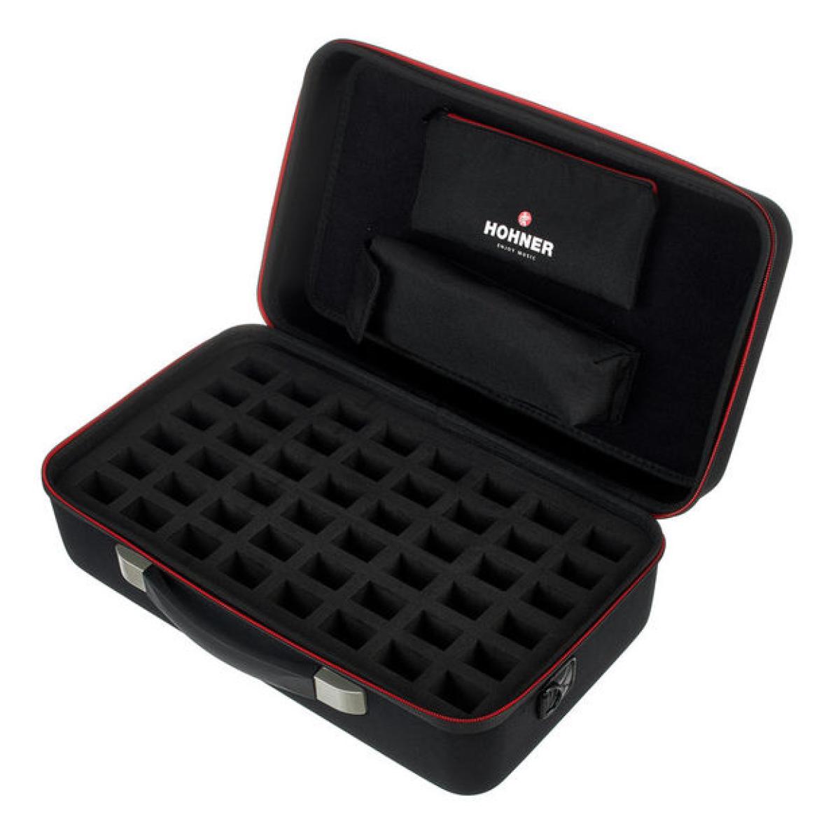 • Flexibilidade máxima na configuração: A bolsa oferece espaço para 48 harmônicas diatônicas ou 30 harmônicas diatônicas mais duas harmônicas cromáticas de três oitavas ou 30 harmônicas diatônicas mais uma harmônica cromática de quatro oitavas