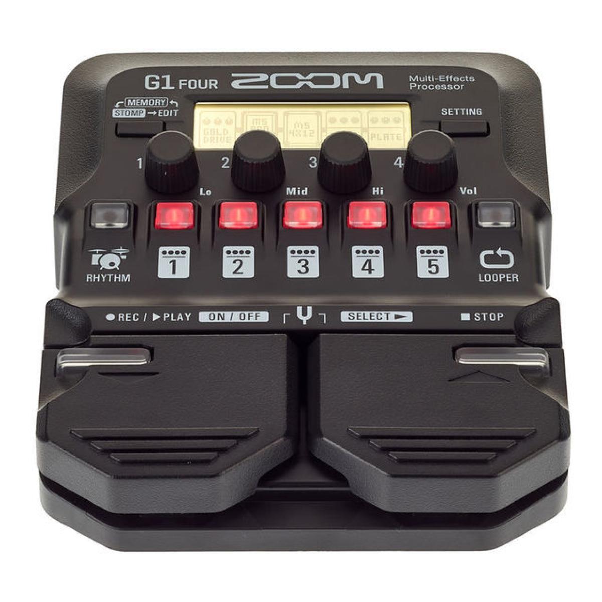 Você também pode fazer uso de um Looper integrado, oferecendo a capacidade de gravar até 30 segundos / 64 batidas de reprodução para criar arranjos emocionantes e dinâmicos em várias partes. O Looper é ativado usando o botão dedicado, enquanto o pedal REC / PLAY controla a gravação e a reprodução, com o pedal STOP para cancelar ambos. Você pode overdub seus loops com facilidade, simplesmente pressionando o botão REC / PLAY durante a reprodução. Você também pode usar os 68 padrões rítmicos internos do G1 FOUR com o Looper, oferecendo uma gama diversificada de possibilidades sonoras com diferentes opções de assinatura de tempo.