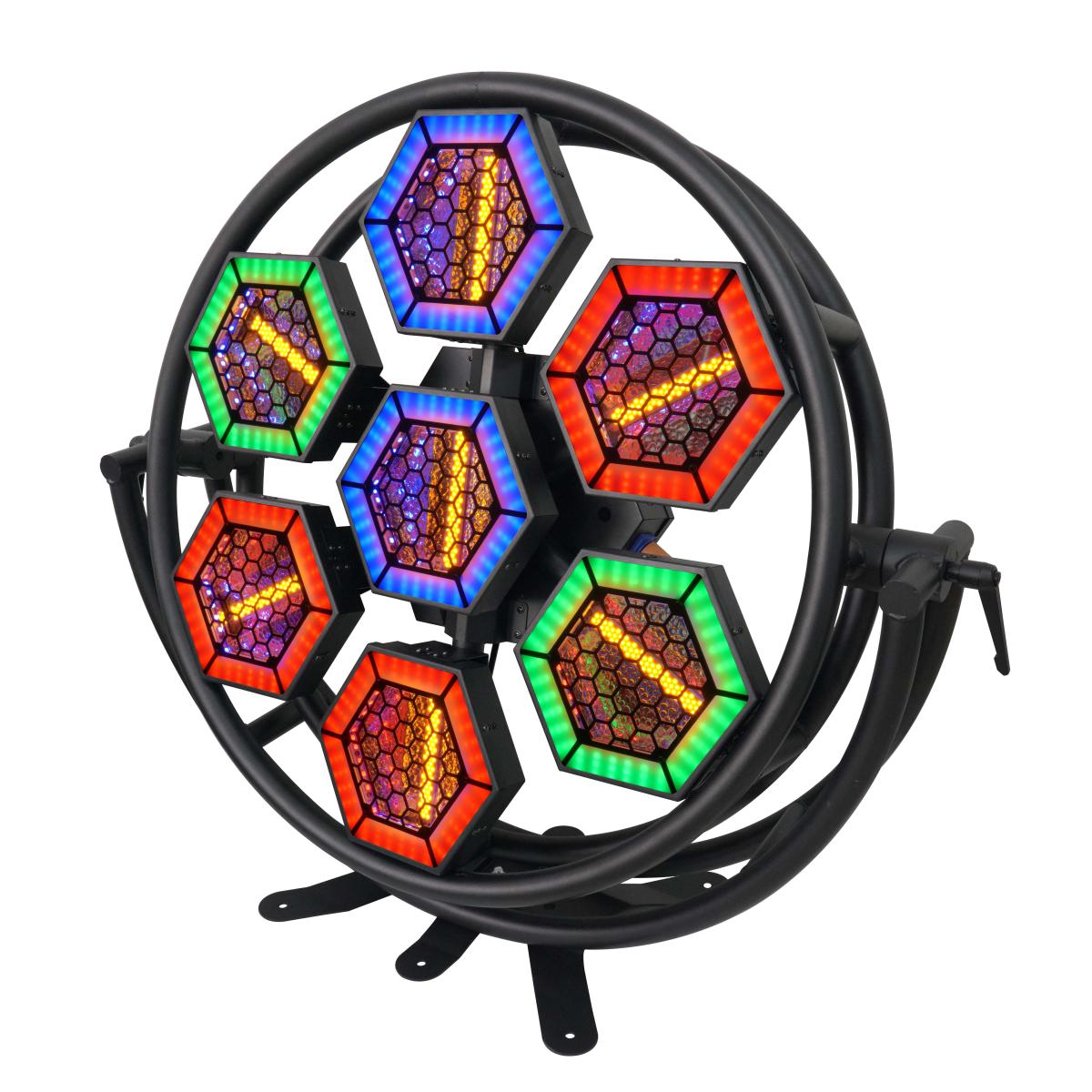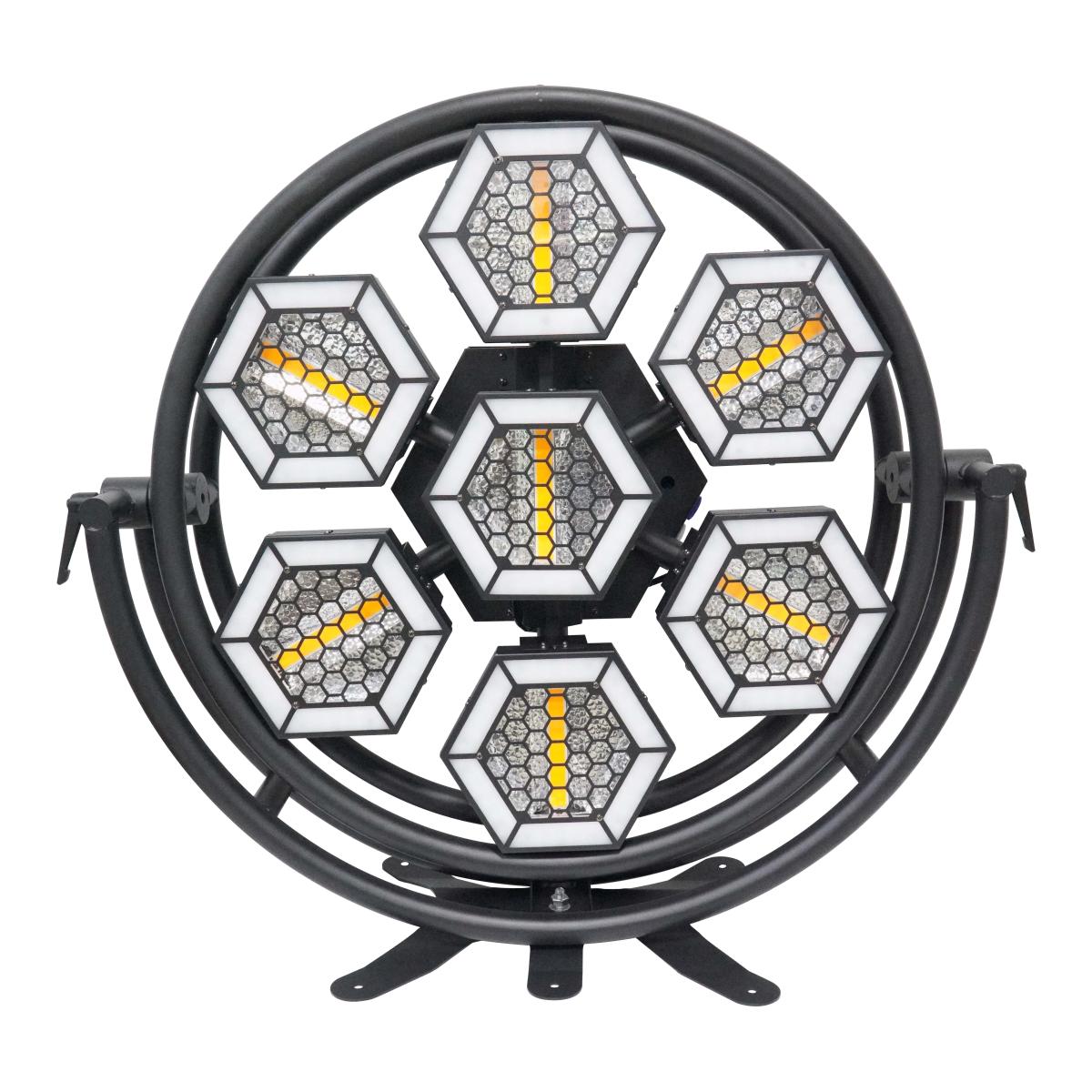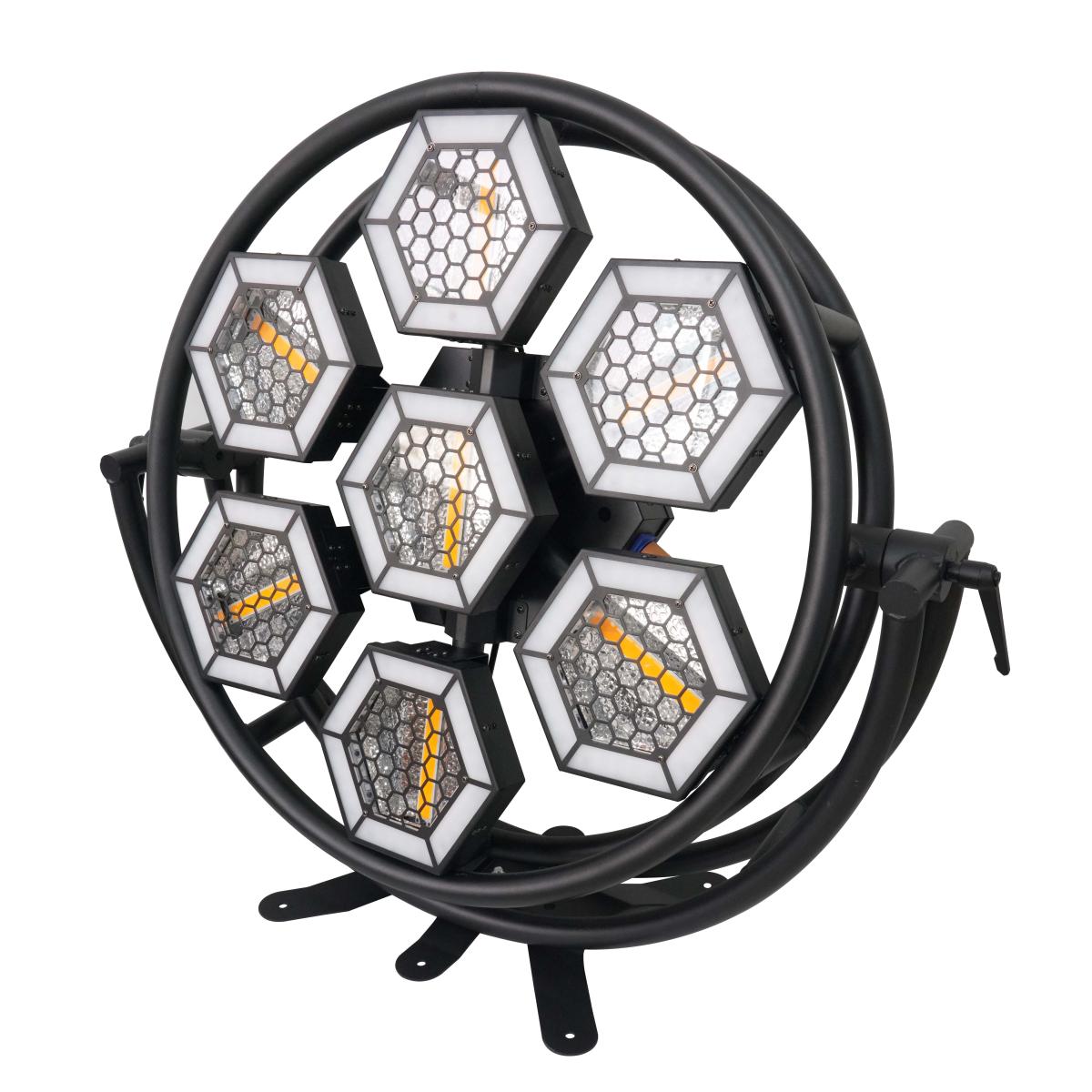 O  é um projetor de iluminação profissional de alto desempenho com design retro, ideal para grandes palcos, concertos, discotecas e produções audiovisuais exigentes. Graças à combinação de potentes LEDs COB branco quente e uma elevada densidade de LEDs RGB, proporciona efeitos visuais impressionantes, envolventes e altamente dinâmicos.