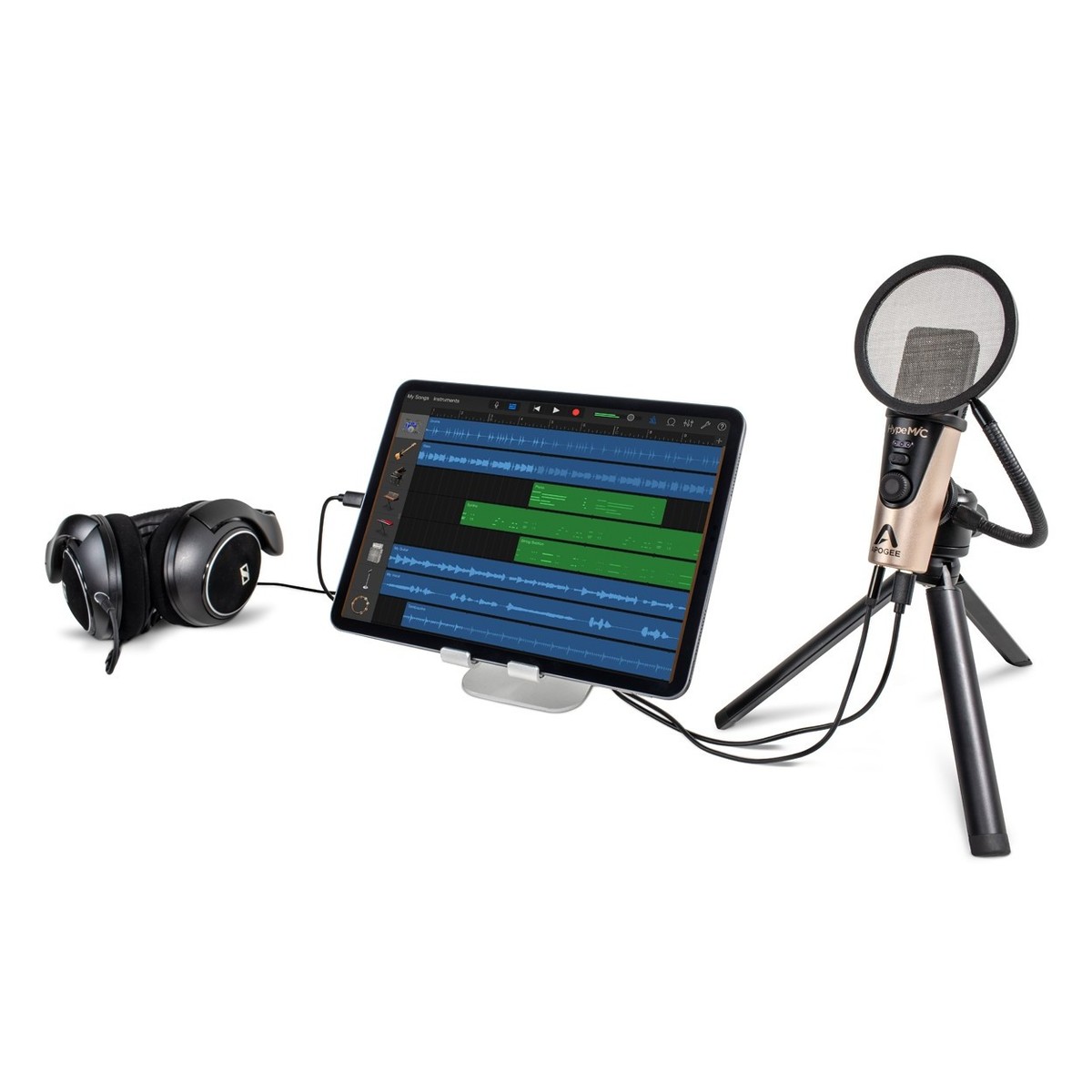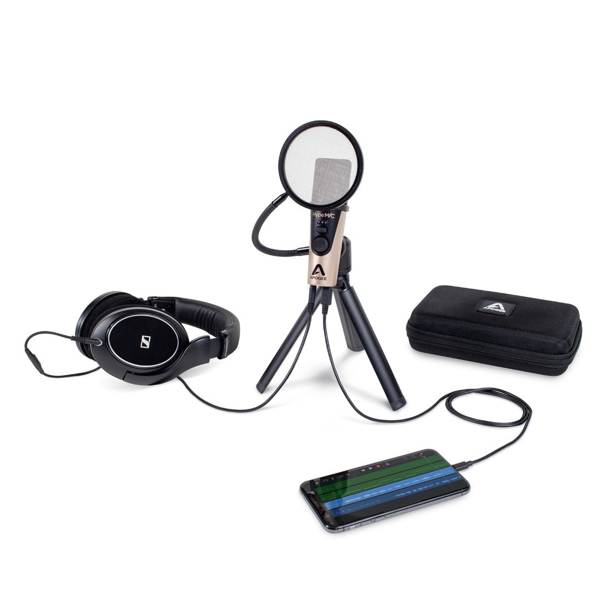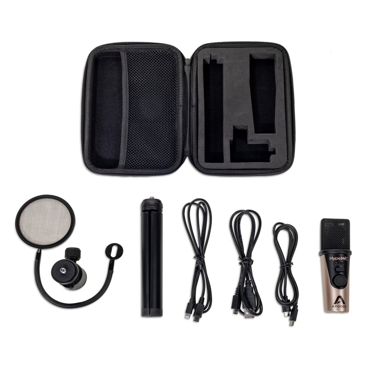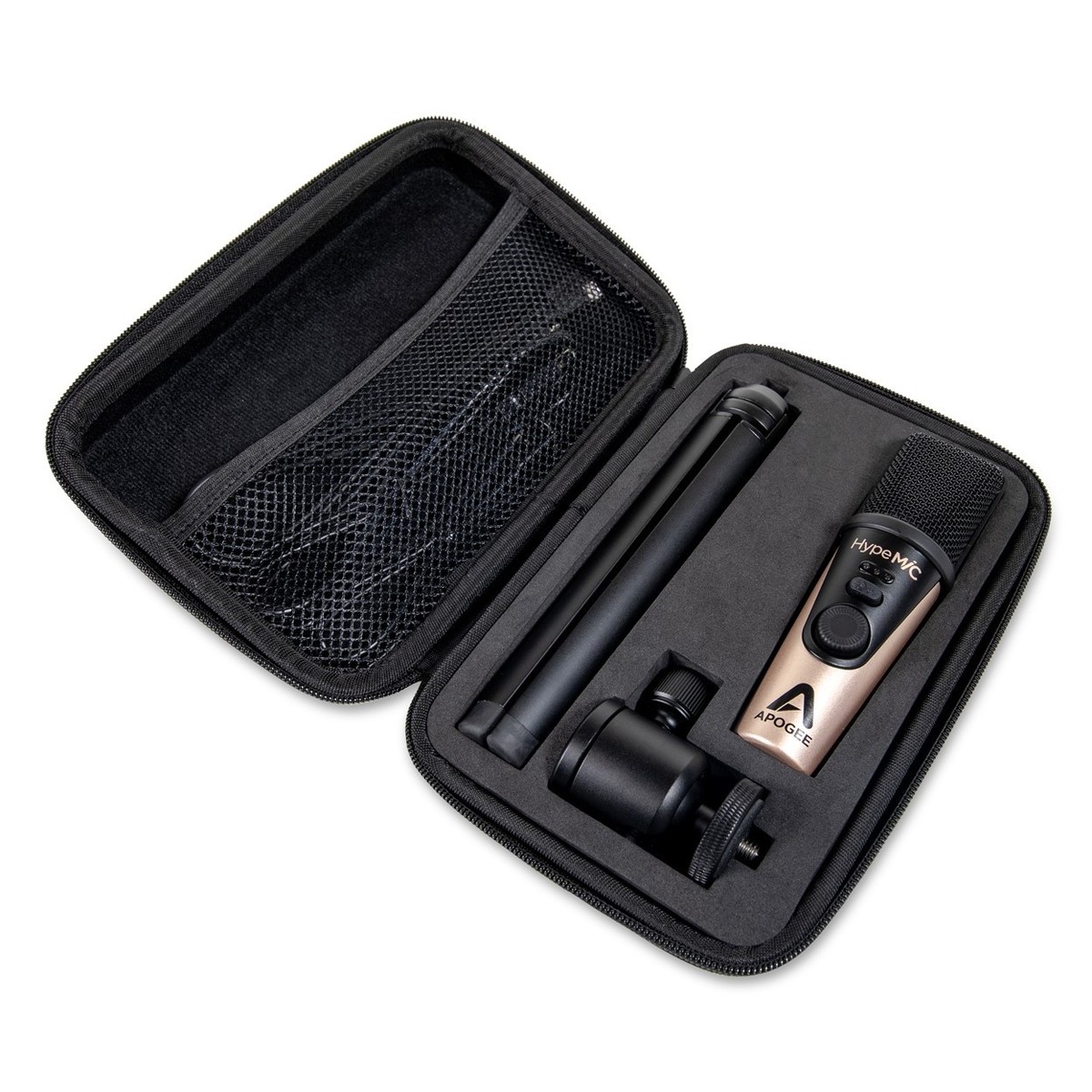 Tudo que você precisa para começar. O Apogee HypeMiC vem completo com uma variedade de acessórios para melhorar o desempenho do seu microfone. Um filtro pop personalizado elimina ruídos indesejados, como pops e sibilâncias de gravações vocais. Um robusto tripé de desktop também está incluído, ideal para podcasters, entrevistadores e tomadas de demonstração. Tudo isso é armazenado em uma bolsa de transporte personalizada que permite que você leve seu microfone e acessórios aonde quer que vá.