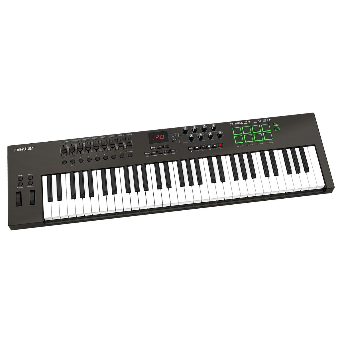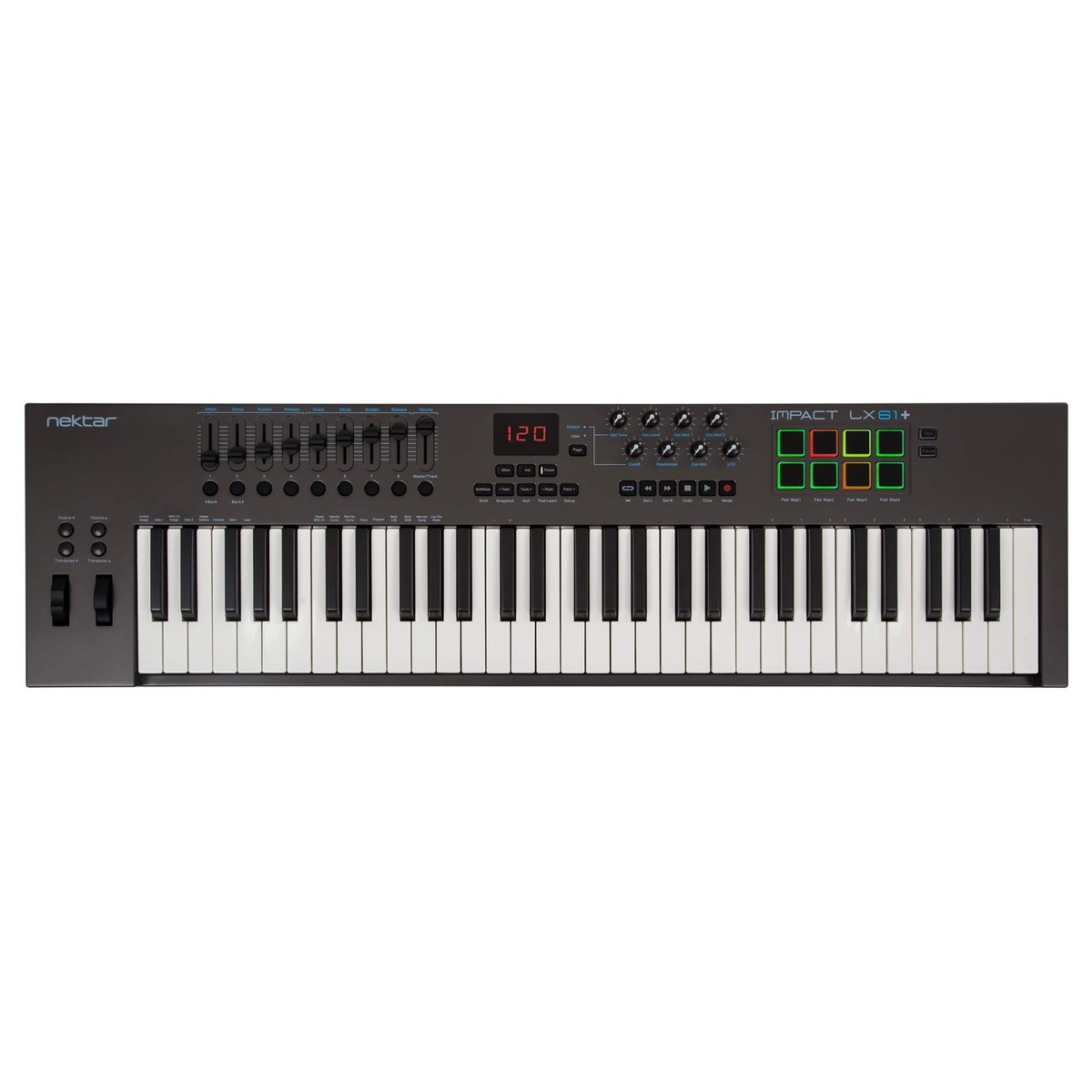 O Nektar Impact LX61 + foi projetado para fornecer a você controle completo sobre sua estação de trabalho de áudio digital favorita, fornecendo tudo o que você precisa, além de extras adicionais que irão melhorar seu fluxo de trabalho e experiência geral. O design ergonómico do Impact LX61 + é utilizado para fornecer tudo o que você precisa no próprio teclado, minimizando a necessidade de alternar entre o software e o hardware para obter o som ou efeito desejado. O teclado sensível à velocidade de 61 notas oferece teclas suficientes para abranger mais de seis oitavas. As teclas sensíveis à velocidade adicionam fluidez e toque natural ao LX61 +, ideais para fazer a transição do piano para o teclado MIDI. Ele também adiciona dinâmica ao seu toque, alcançando tudo, desde notas suaves e subtis a acordes poderosos. pads iluminados por LEDs também são sensíveis à velocidade e são perfeitos para acionar samples como vocais ou bateria. Isso oferece outra maneira de tocar sons, seja usando os pads como uma bateria eletrónica ou para pintar linhas de baixo usando o formato de pad