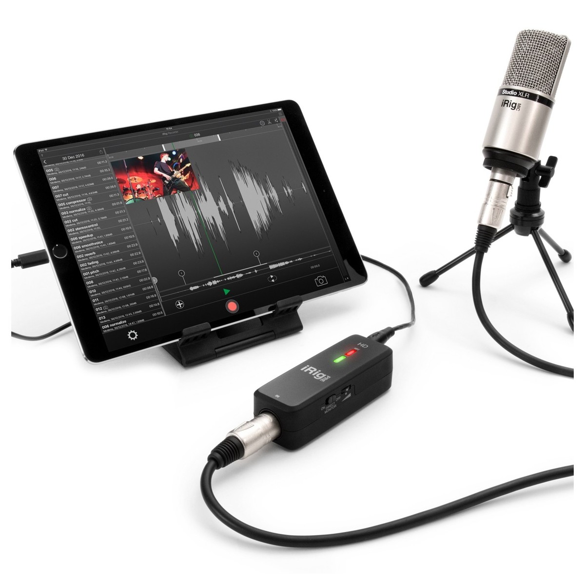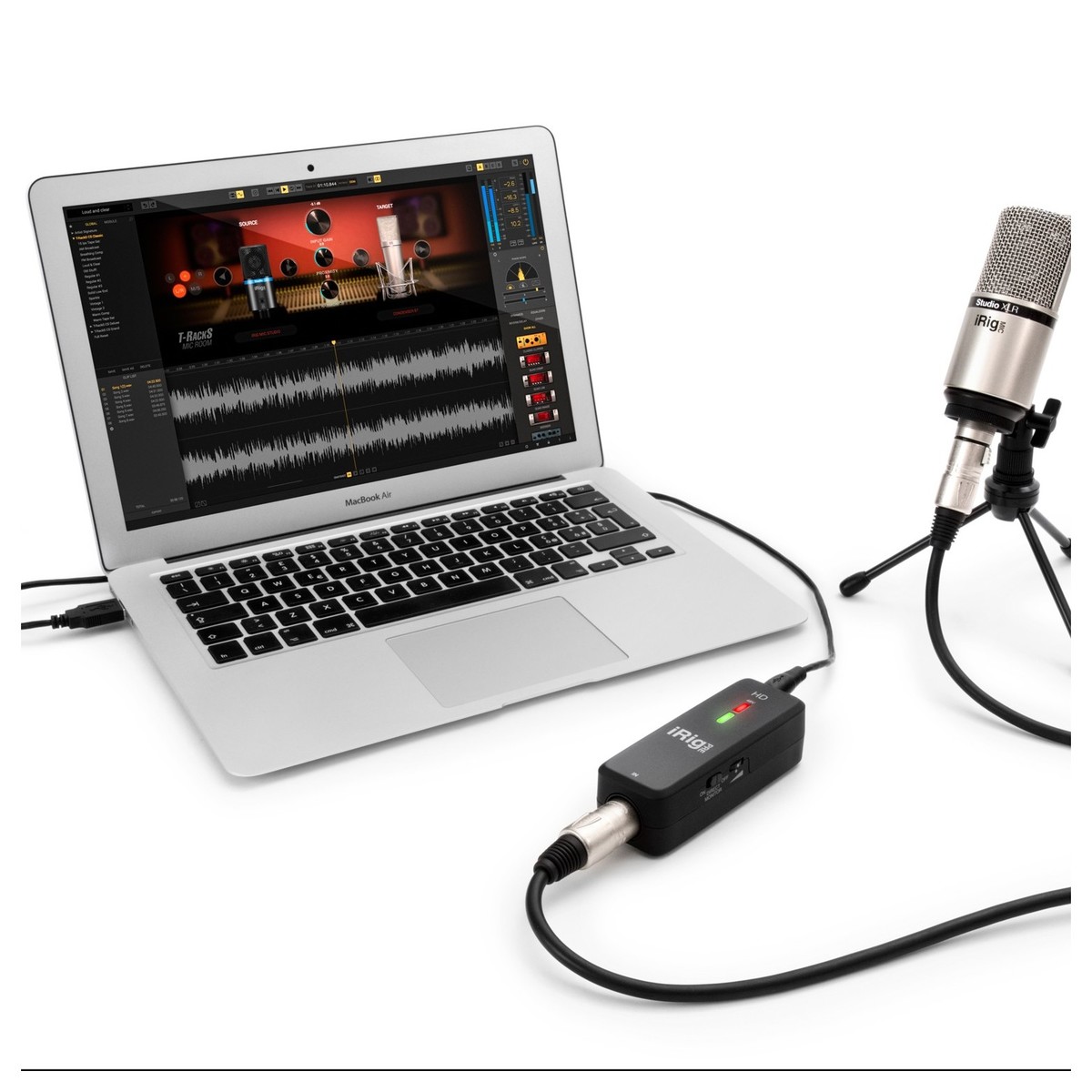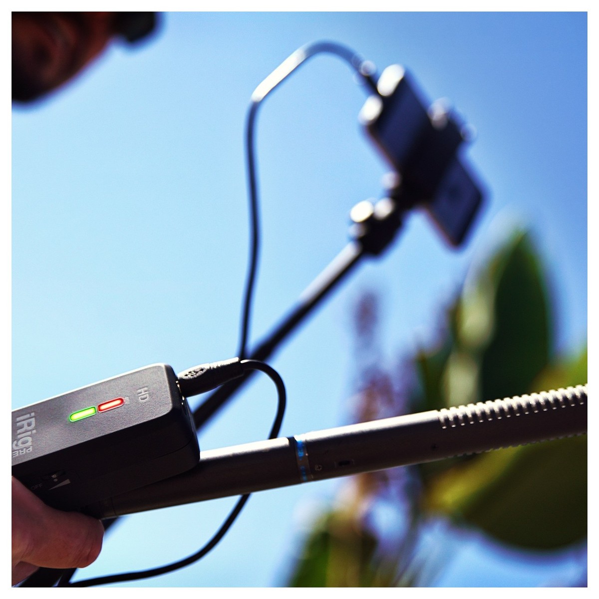 Interface tátil para microfones de estúdio. A Interface de Microfone iRig PRE HD da IK Multimedia para iOS, Android, Mac e PC é uma interface de áudio de 24 bits / 96kHz para smartphones e computadores, permitindo que você capture gravações de estúdio em movimento.