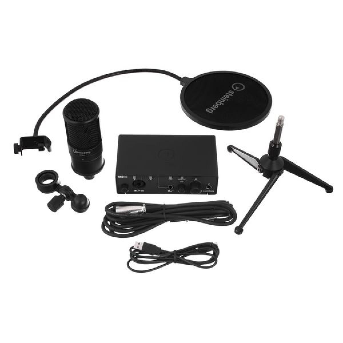 • Conjunto composto por interface de áudio USB 2.0 de 2 canais, microfone condensador ST-M01, filtro pop, suporte de tripé e cabo XLR ;