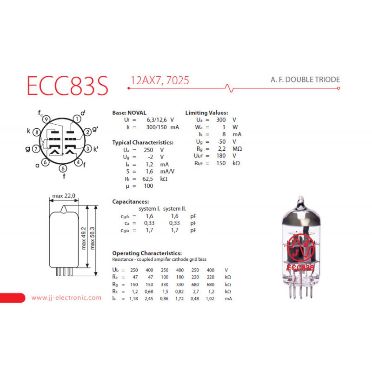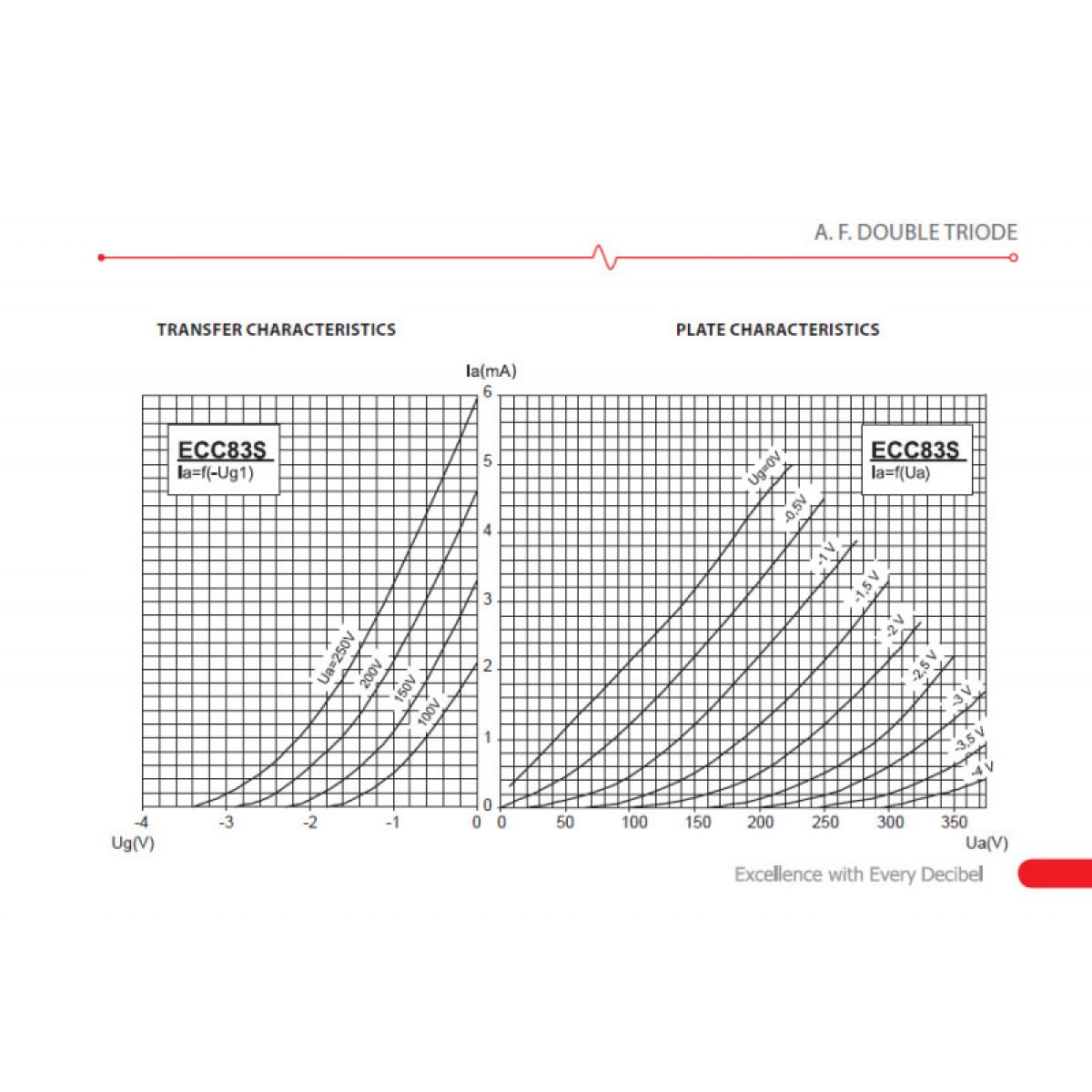 • O ECC83S é um triodo duplo de pré-amplificação 12AX7 de alto ganho. Graças ao seu design, também funciona com ruído e microfonia muito baixos. Harmonicamente rico, com graves detalhados e agudos quentes;