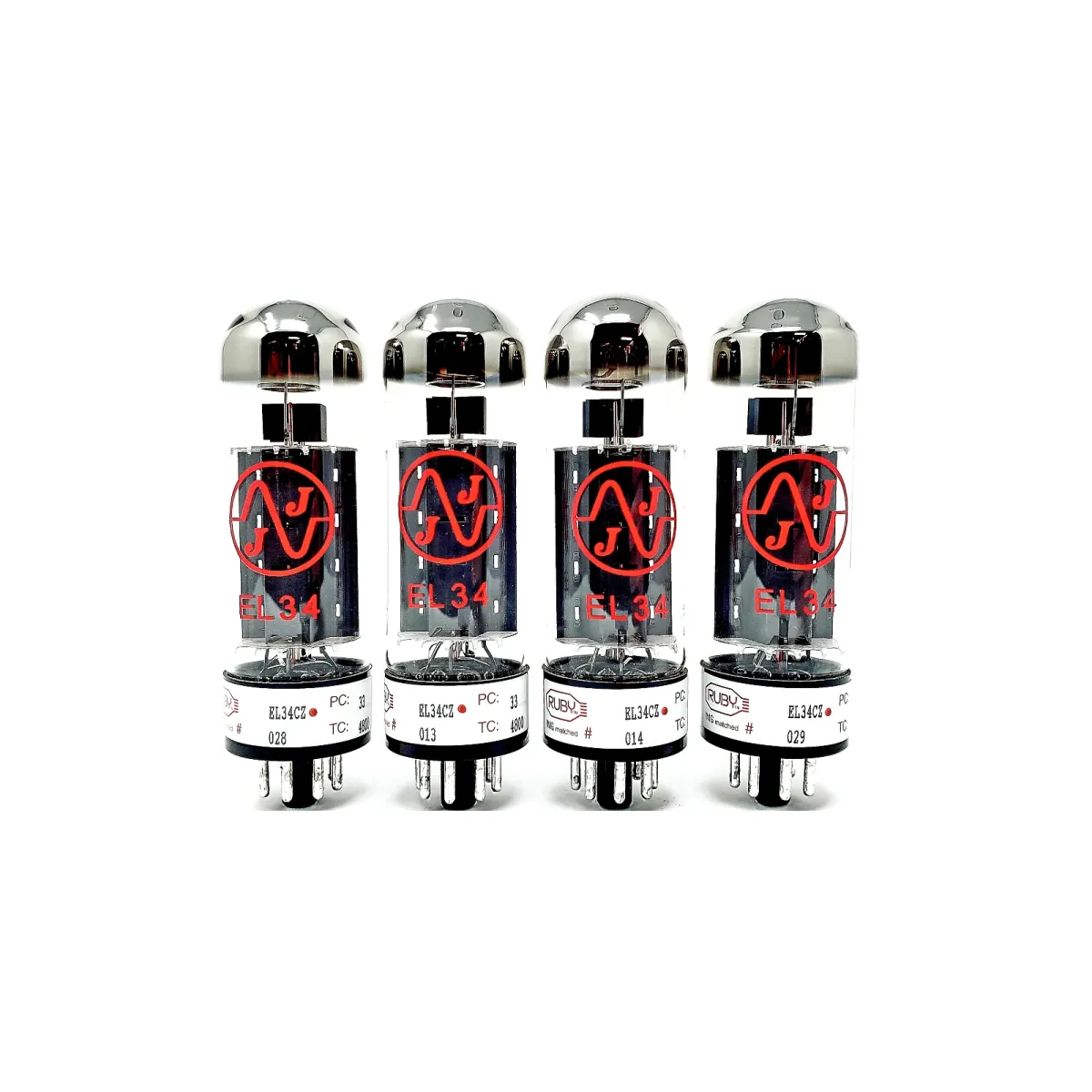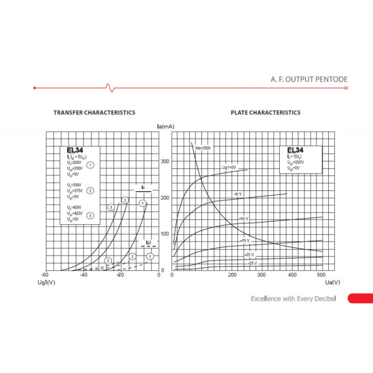 • A EL34 é uma válvula de potência octal com uma potência máxima de placa de 25W. Muito robusta e fiável devido à sua construção interna;