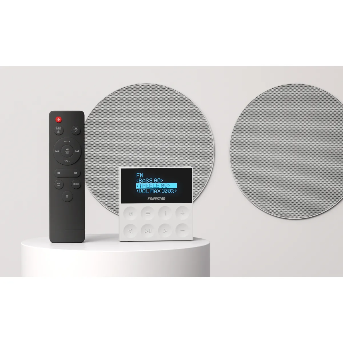 O Fonestar KS-WALL é um kit de som completo “tudo em um” que inclui amplificador estéreo de parede e 2 colunas de teto de 6", ideal para sonorização ambiente em habitações, lojas, escritórios ou salas de espera. Permite várias opções de reprodução e instalação discreta em caixa de parede standard.