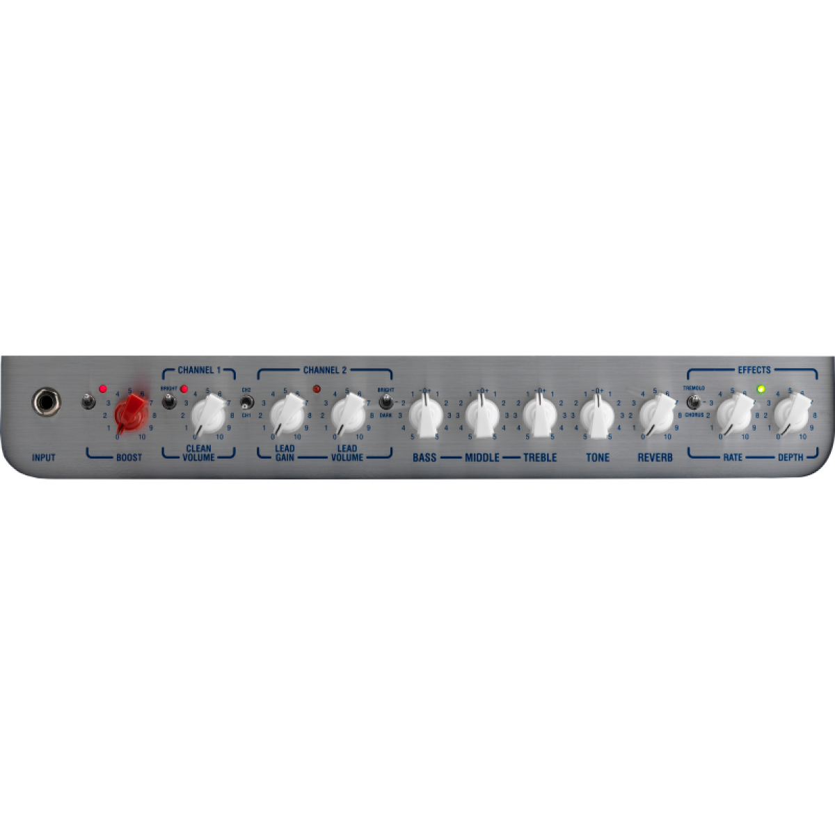 • Tremolo Vintage com velocidade e nível, comutável com o pé;