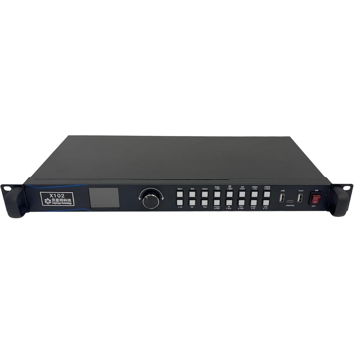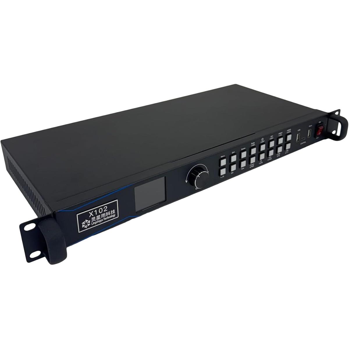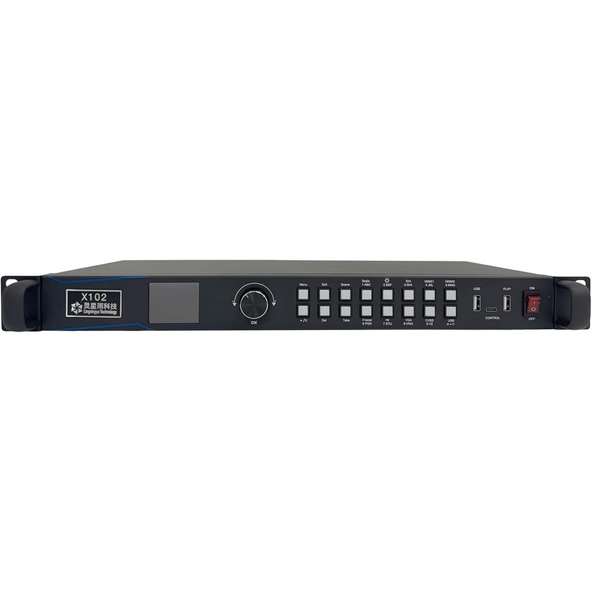 X102 concebido para ecrãs LED de instalação fixa de pequena dimensão. Integra função de envio e processamento de vídeo, com suporte para utilização direta via pen USB (plug and play). Suporta até 1,3 milhões de píxeis: até 3840 píxeis na horizontal ou 1920 píxeis na vertical.