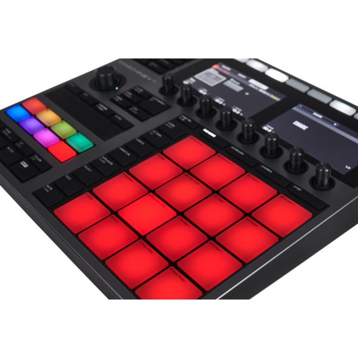 • Efeitos e plug-ins Maschine, swing, ligação de pads, repetição de notas, sequenciador de passos e emulação de sampler vintage ;