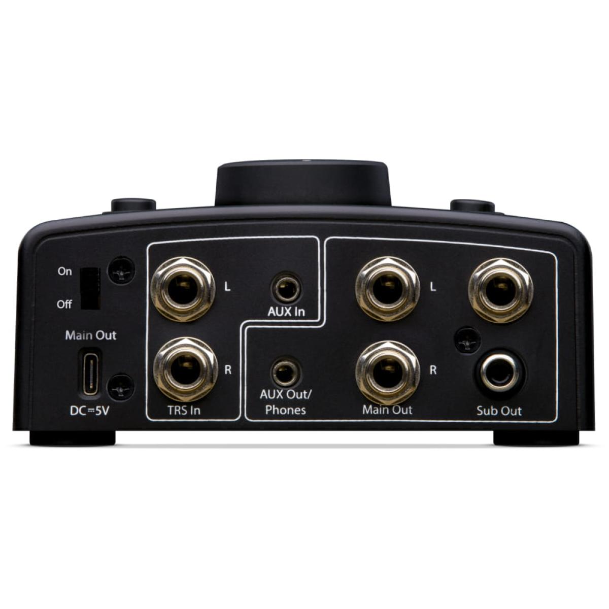 • Entradas: 1x TRS In L / R (conector de 6,3 mm, balanceado), 1x Aux In (conector de 3,5 mm, balanceado); Saídas: 1x Main Out L / R (jack de 6,3 mm, balanceado), 1x Aux Out (jack de 3,5 mm, balanceado), 1x Sub Out (jack de 6,3 mm, balanceado) e 1x Sub Out (RCA, não balanceado);