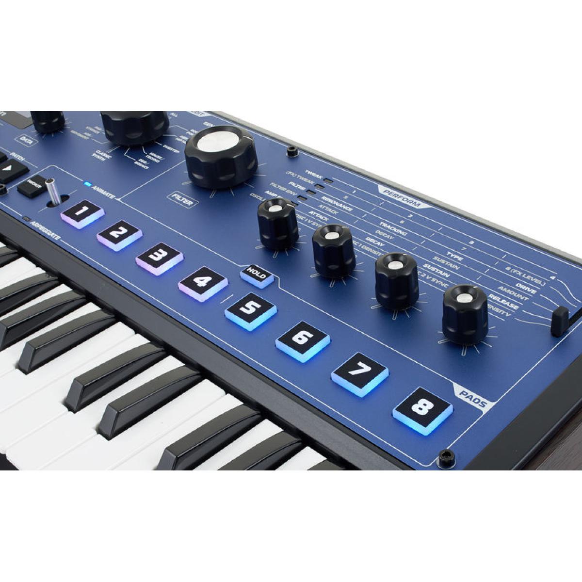 O MiniNova pode fazer coisas que outros sintetizadores não podem. Possui botões que permitem ajustar e editar os sons, mas também pode 'animar' o som com 8 botões retroiluminados. Estes acionam 'mods' no engine sintetizador que podem distorcer o som de maneiras incríveis enquanto você toca. Há também um botão grande para o corte do filtro, para que você possa ter controle instantâneo do filtro, independentemente do que estiver fazendo. MiniNova tem um arpejador; você pode usar os 8 botões para tocar com arpejos, criando sequências totalmente novas em tempo real.