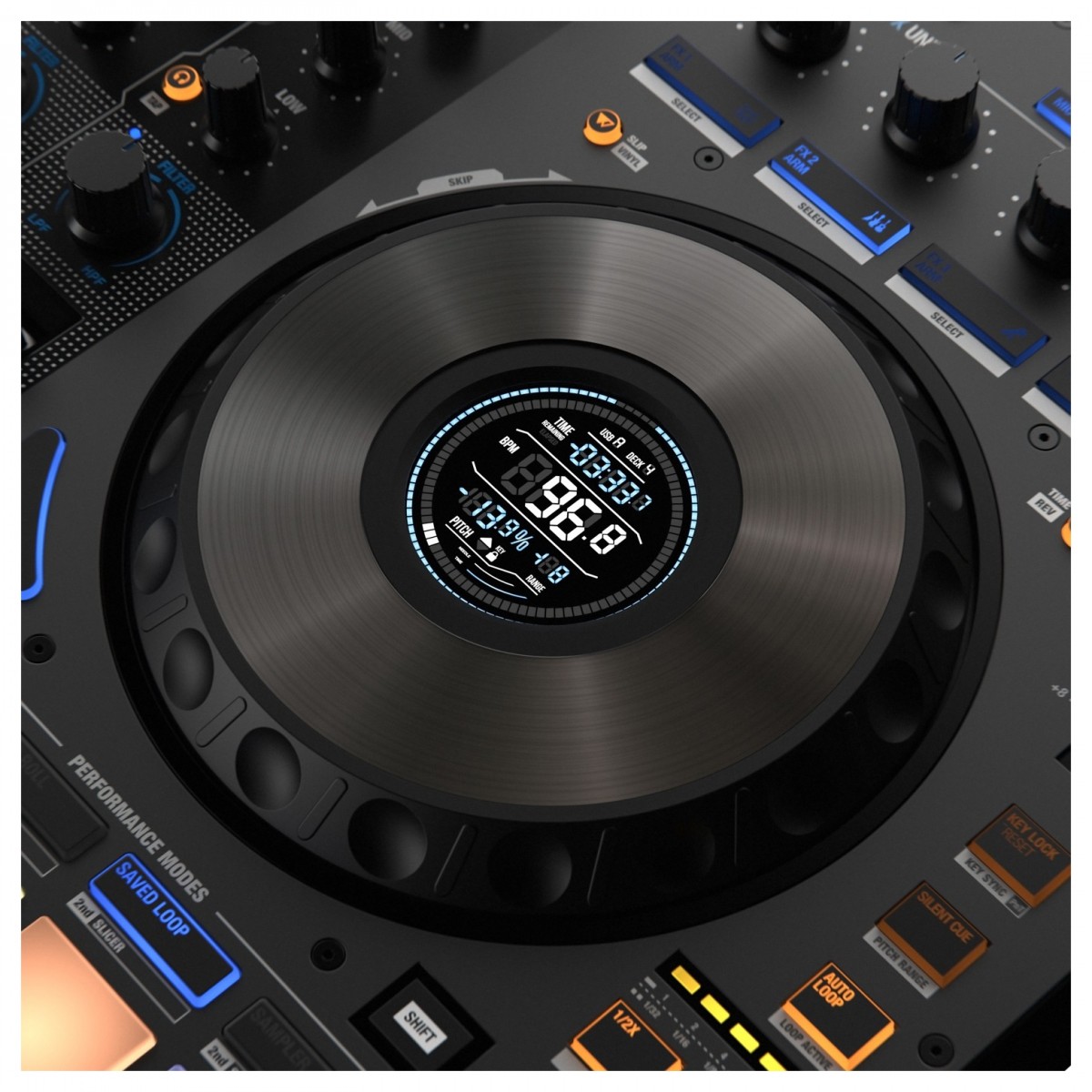 Ver informações sobre a pista num relance graças aos mostradores integrados de jog wheels que fornecem informações em tempo real sobre tudo, desde BPM e nomes de pistas até à posição do stylus virtual. Criar enormes transições e incorporar uma gama de efeitos utilizando qualquer um dos quatro comutadores FX individuais. Também é possível criar build-ups e misturar com precisão usando o filtro de cor de som dedicado (disponível em cada um dos quatro canais). A secção de mistura também pode atuar como um misturador autónomo, permitindo misturar tanto fontes digitais como analógicas, tais como media players e gira-discos.