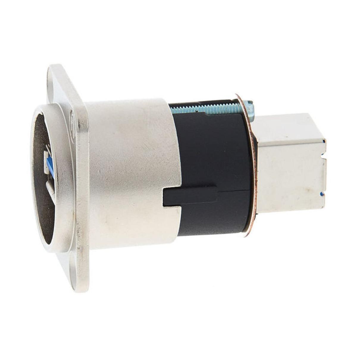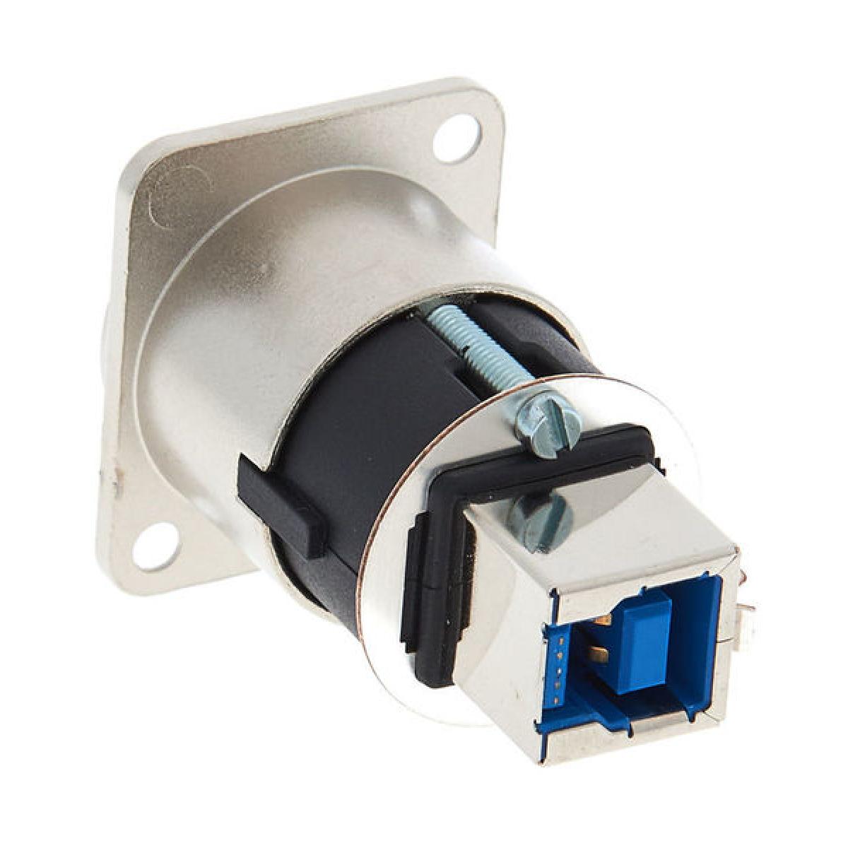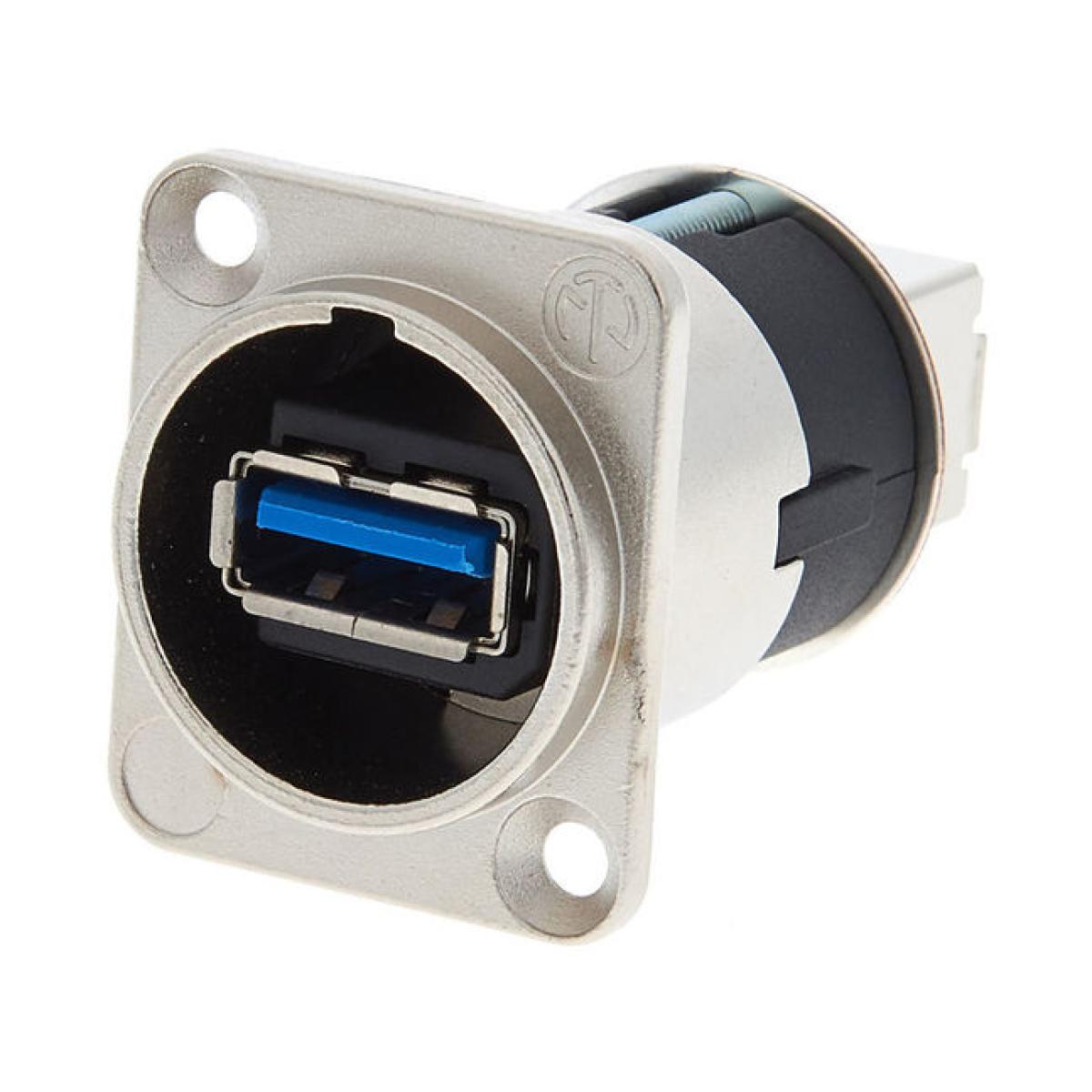 • O NAUSB3 é um feed USB 3.0 reversível através do adaptador. A carcaça padronizada em forma D do adaptador se encaixa nos painéis de remendo convencionais e oferece uma proteção adicional para o conector.