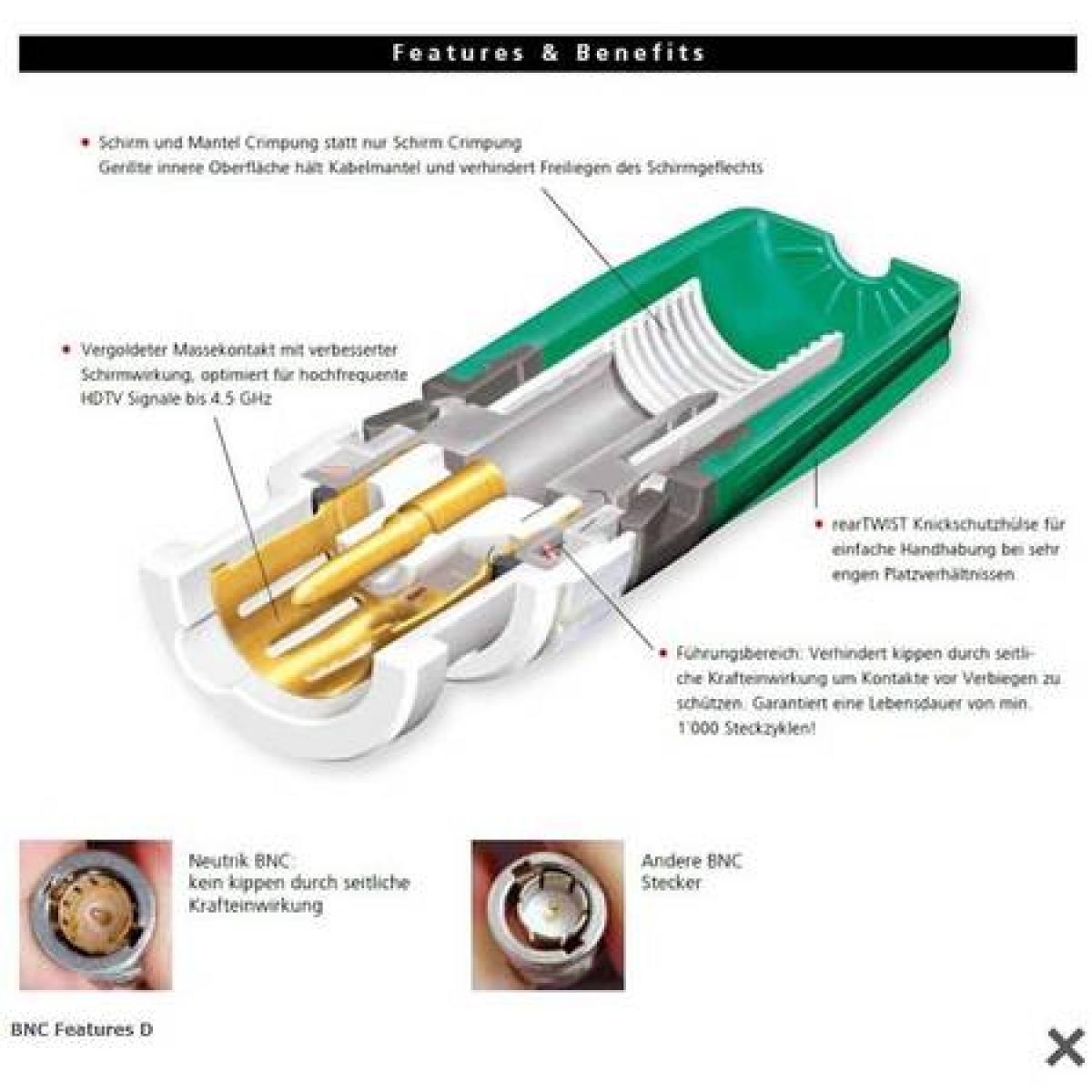 O conector de cabo 75 Ω RearTwist ® BNC oferece excelente retorno menos valores e, portanto, é ideal para aplicações HDTV.