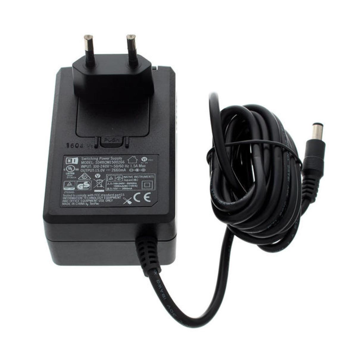 Carregador universal para unidades Traktor Kontrol. A fonte de alimentação Native Instruments 40 Watts é uma fonte de alimentação compacta que vem completa com plugues adaptáveis substituíveis.