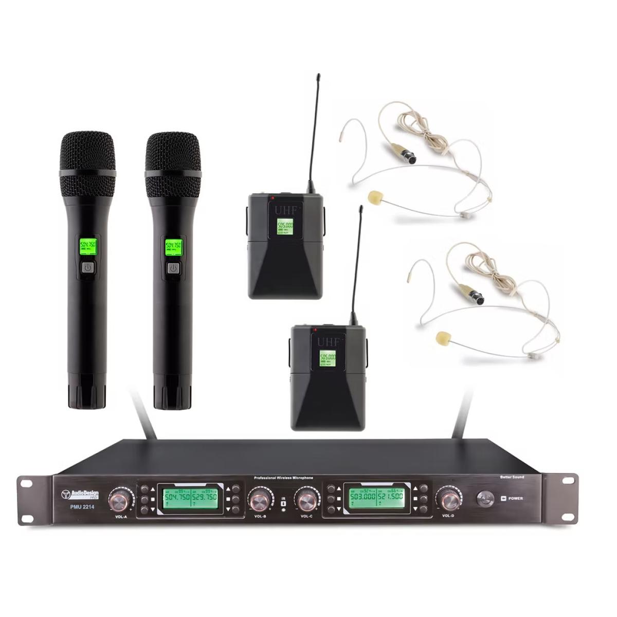 • 100 frequências: de 480,000 a 504,750 MHz Unidade central + 2 bodypacks com microfones de arnês e 2 microfones de mão ;