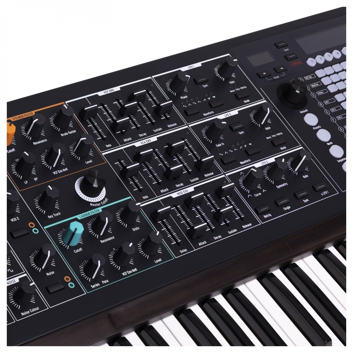 No centro do PolyBrute encontra-se um polissinteto versátil, de seis vozes dual VCO analógico. Graças ao Steiner Parker, filtro de escada, três envelopes, e LFOs, será capaz de melhorar o seu som, e até mesmo de o transformar para além do reconhecimento. Leve isto mais longe, envolvendo-se com todo o conjunto de efeitos incluídos, tais como delay, coro, reverb, e modulação.