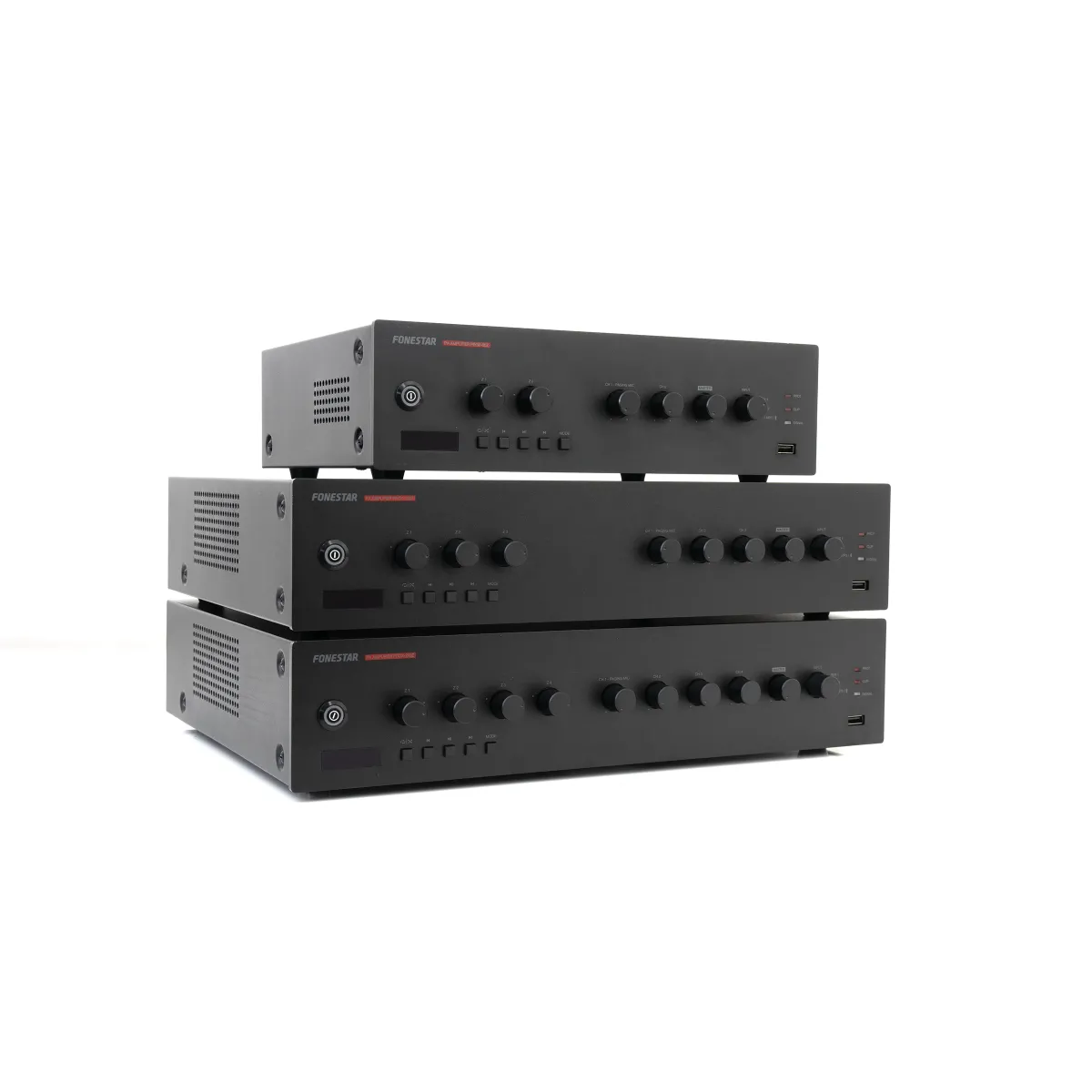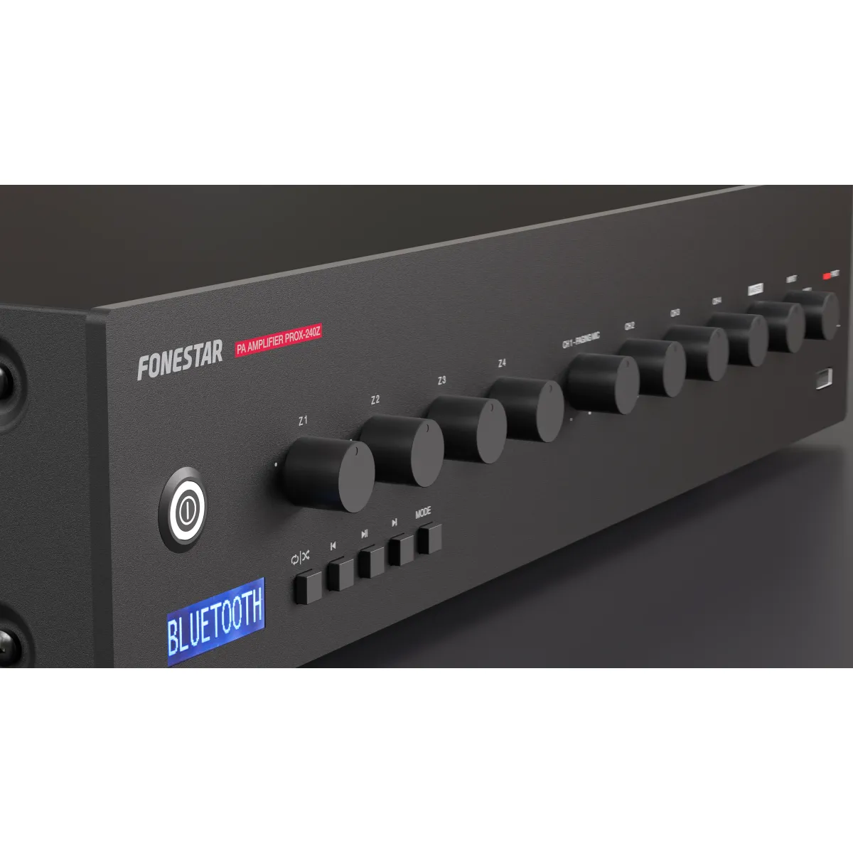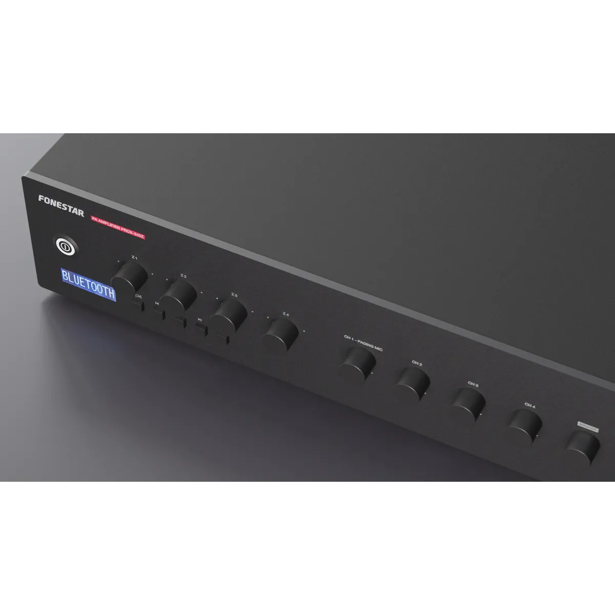 Amplificador de megafonía Fonestar PROX‑240Z com 240 W RMS, reprodução Bluetooth/USB/FM e 4 zonas de saída com controlo independente de volume.