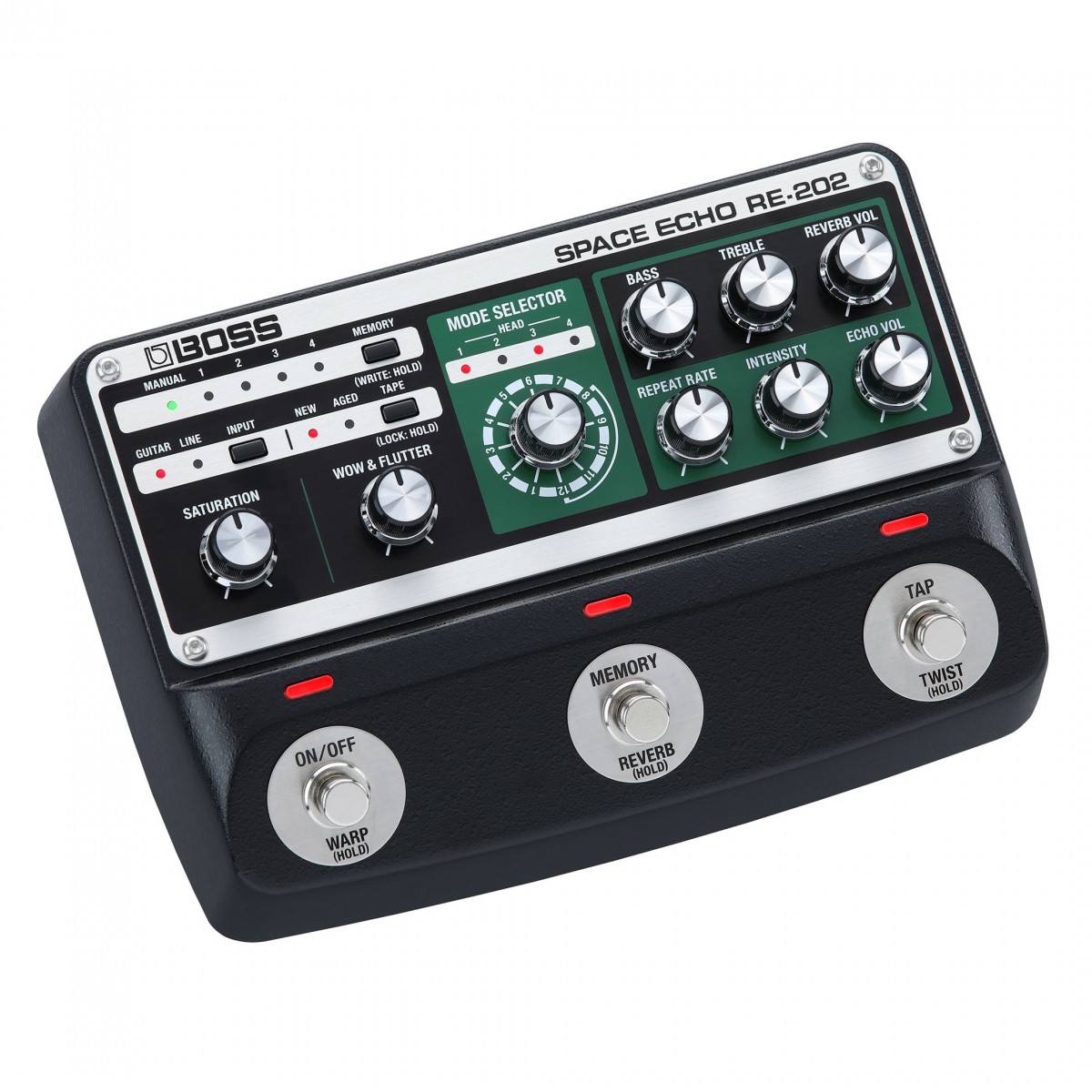 Um pedal extremamente versátil, você será capaz de combinar um som vintage com todas as vantagens e harmônicas tecnológicas modernas. Poderá aceder facilmente e combinar as novíssimas características da RE-202 com as características vintage do pedal clássico. Os comportamentos de fita magnética e pré-amplificador que estavam presentes na RE-201 originalmente podem ser acedidos na RE-202 através do controlo de saturação que proporcionará compressão e calor ao tom, juntamente com o efeito de modulação que pode ser alcançado a partir do controlo Wow & Flutter.