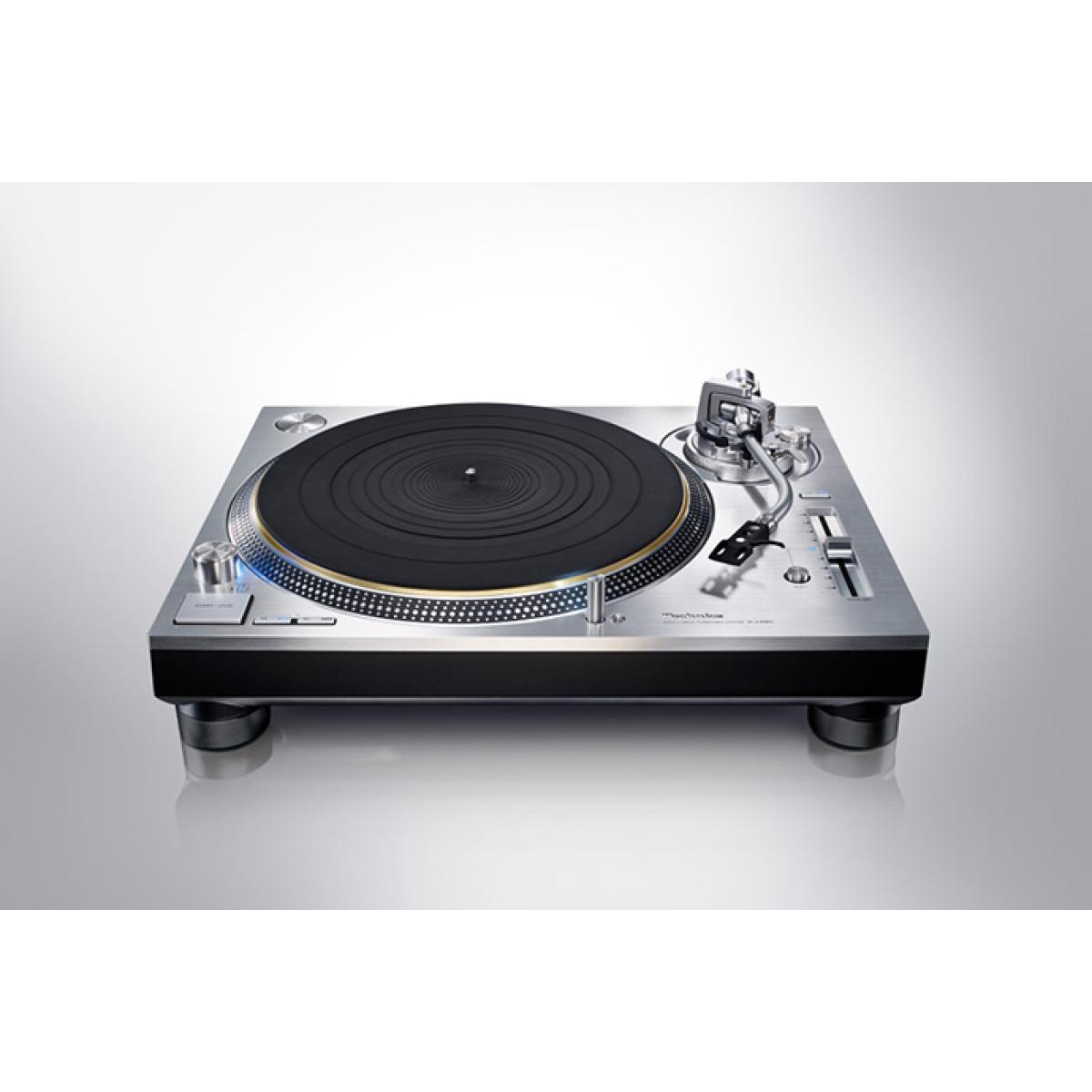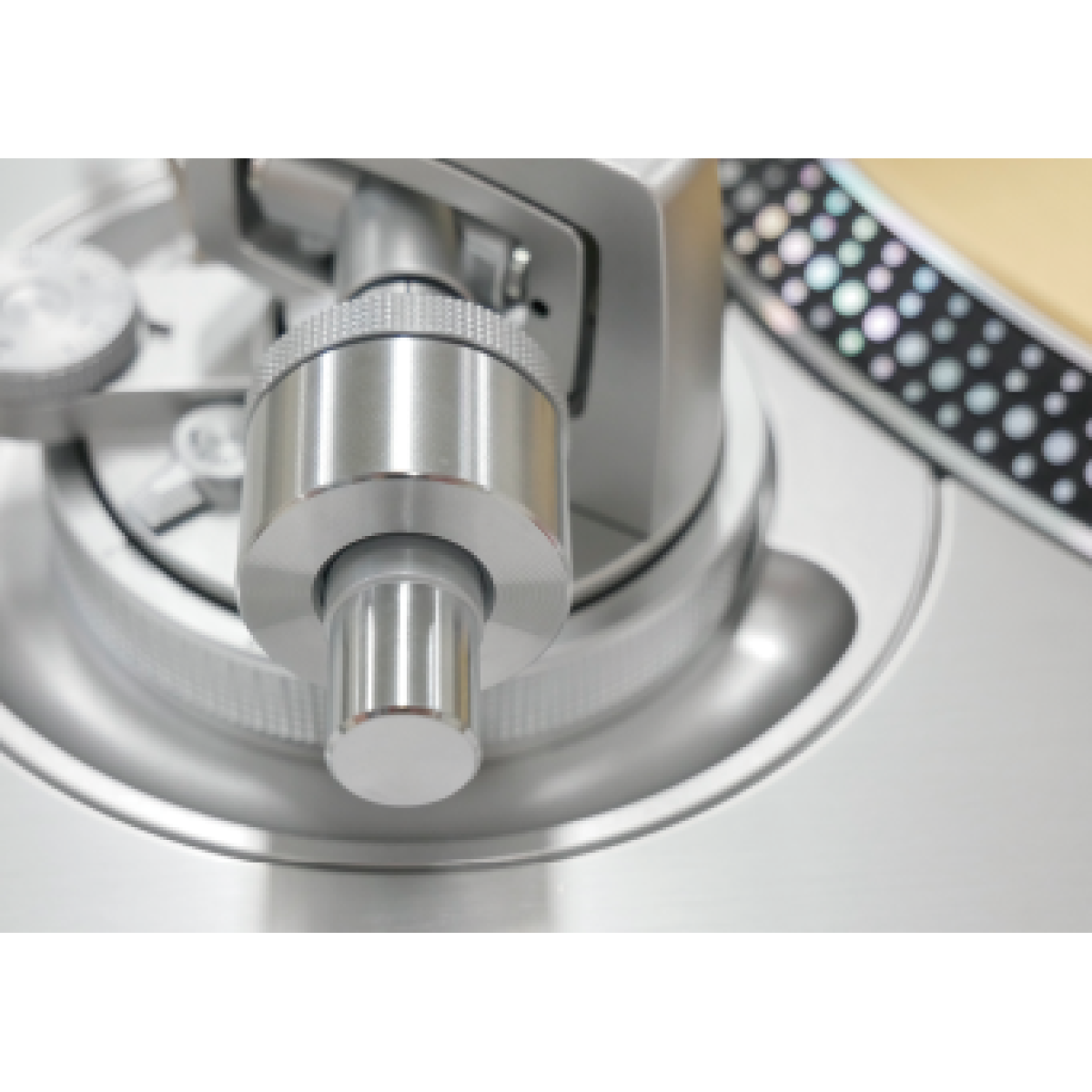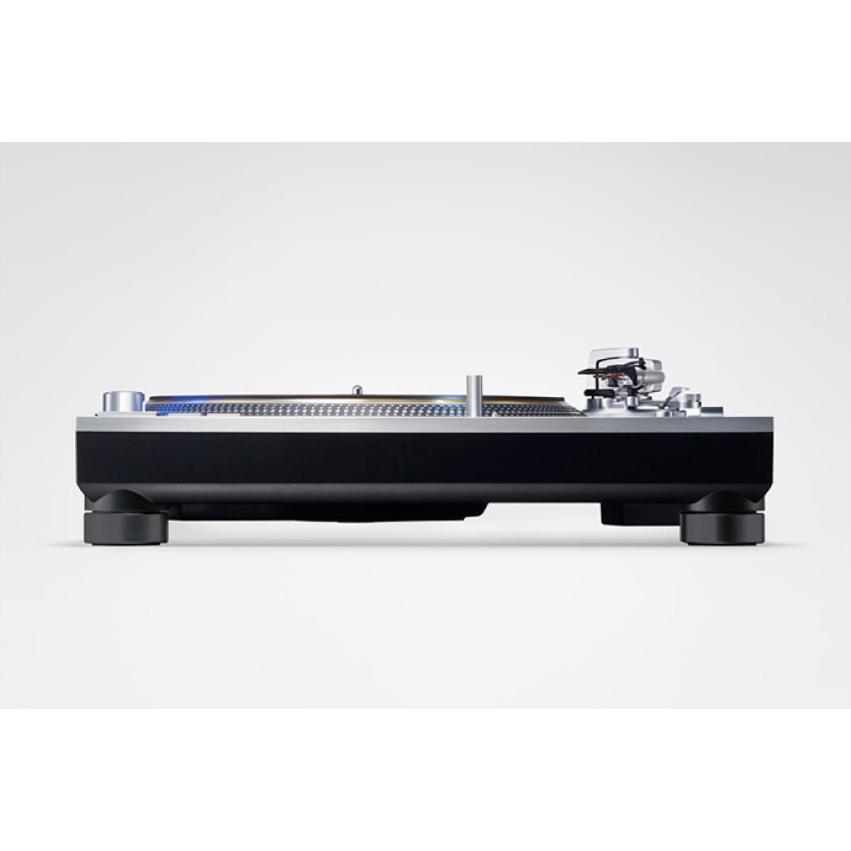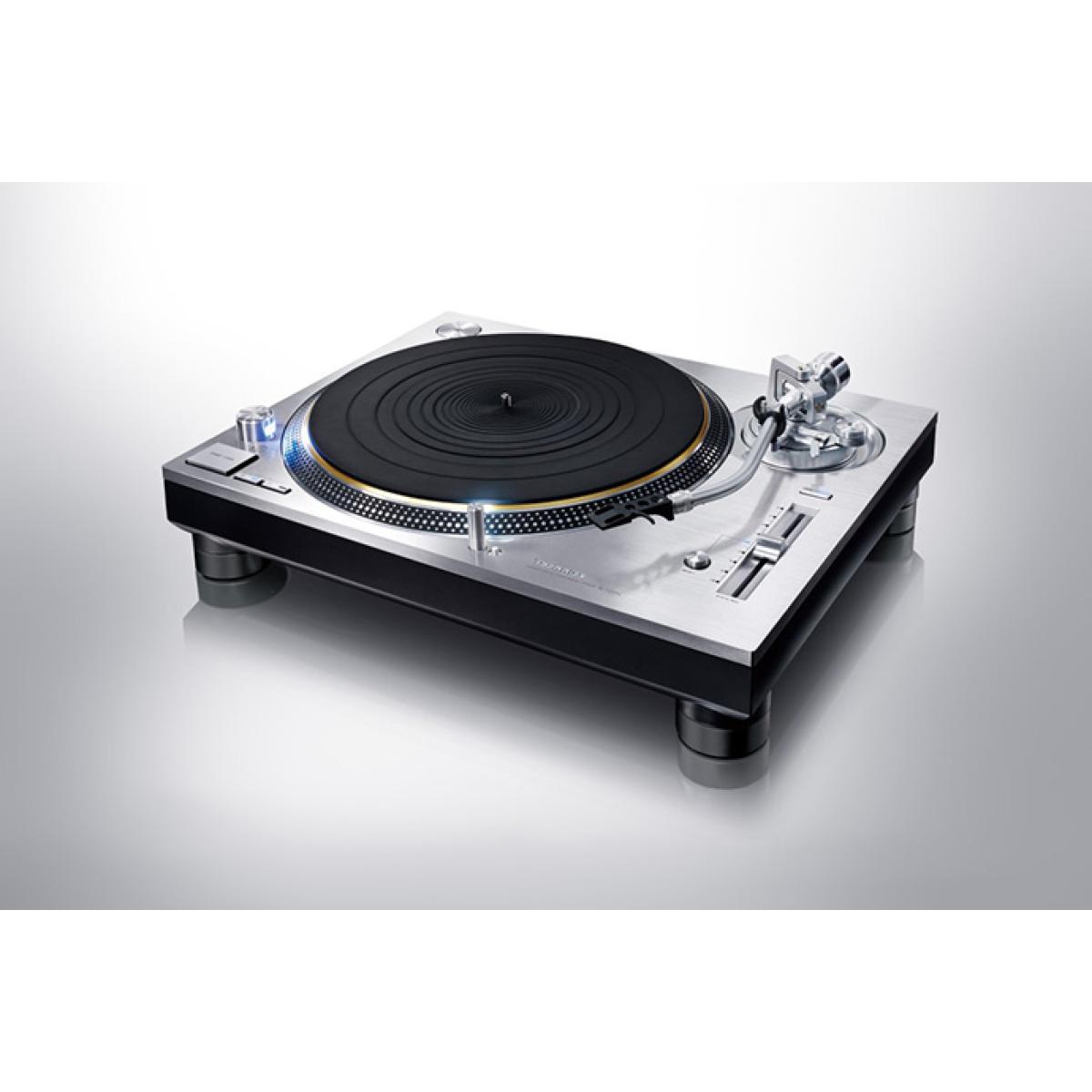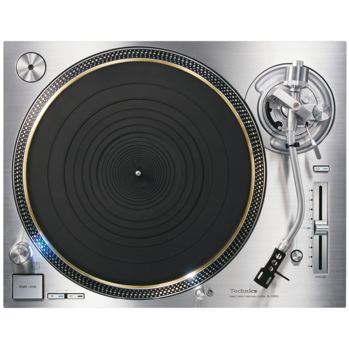 • O toca-discos de acionamento direto padrão Grand Class Technics possui motores de acionamento direto girados para uma superfície de rotor duplo, um controlador de motor de acionamento direto, um braço de tom de alta sensibilidade e um isolador de placa rotativa com uma almofada de latão.